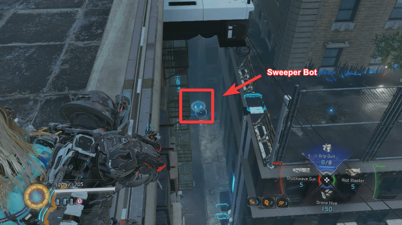 As you explore, move toward the rooftops overlooking the factory floor, because this elevated position gives you a clear view of patrol routes. The Sweeper Bot typically travels in a looped circuit, making it predictable but still difficult to catch if you’re not prepared.