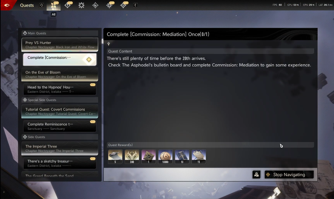 Ensure you’ve finished the Mediation commission before beginning this quest. Completing it unlocks access to the Outsider’s dialogue and advances the storyline toward Prey vs Hunter.