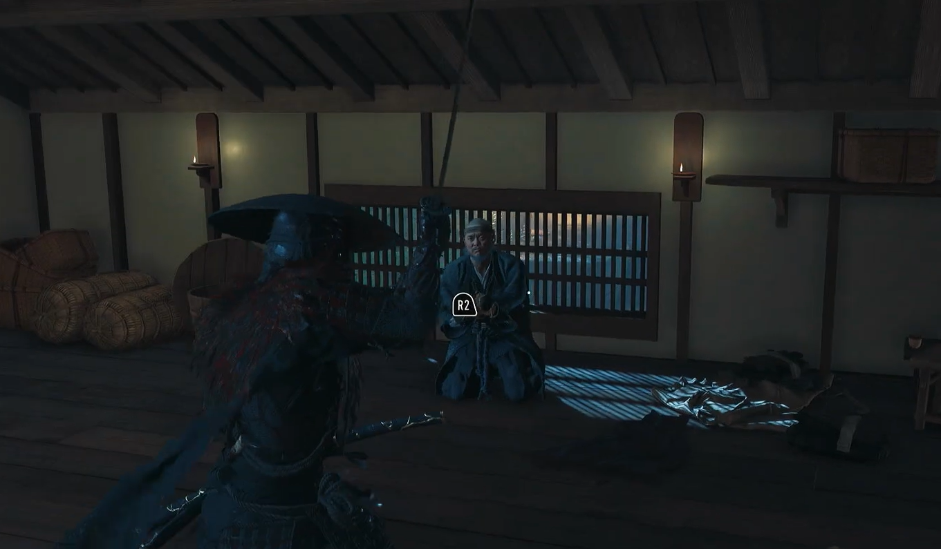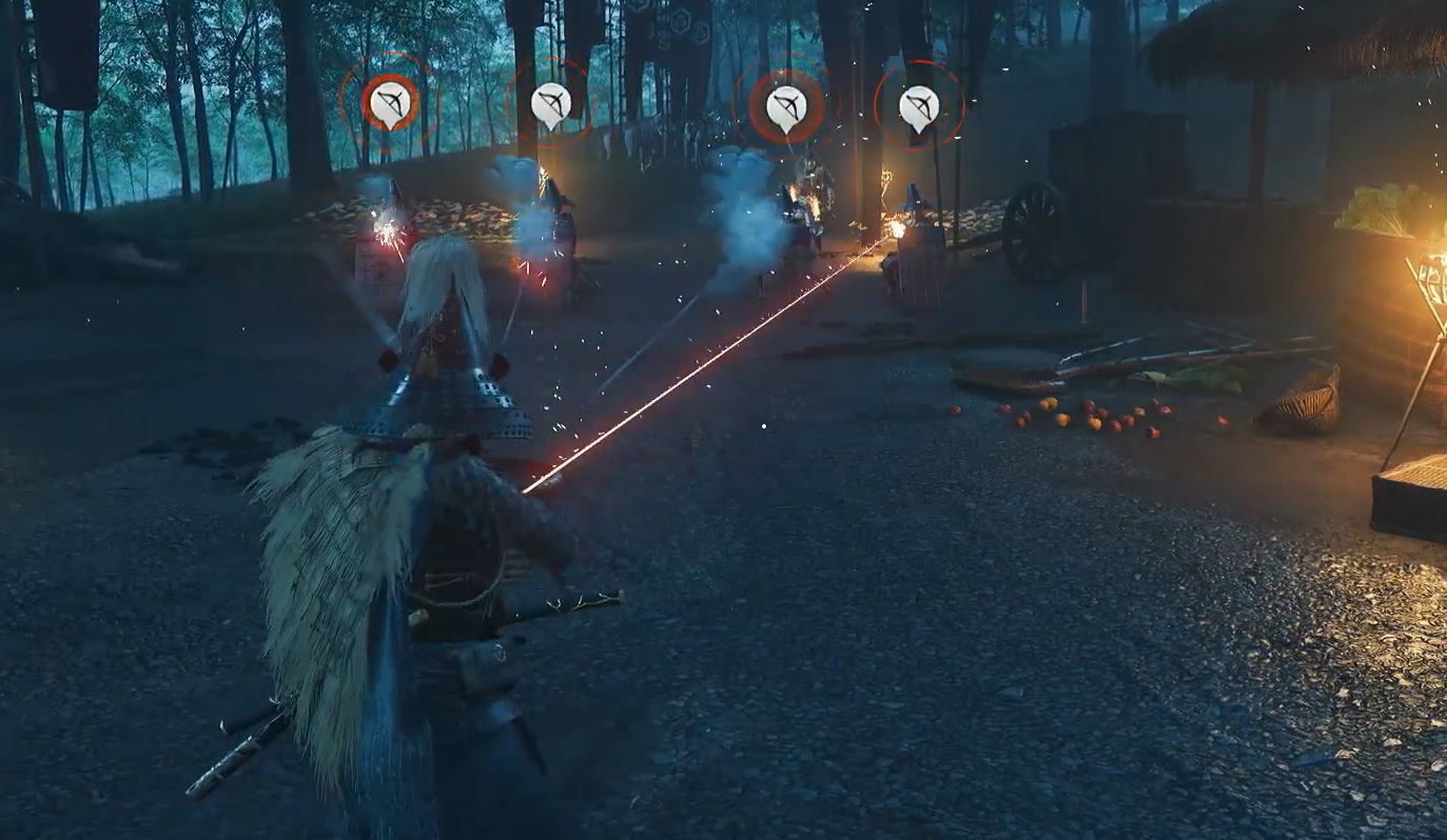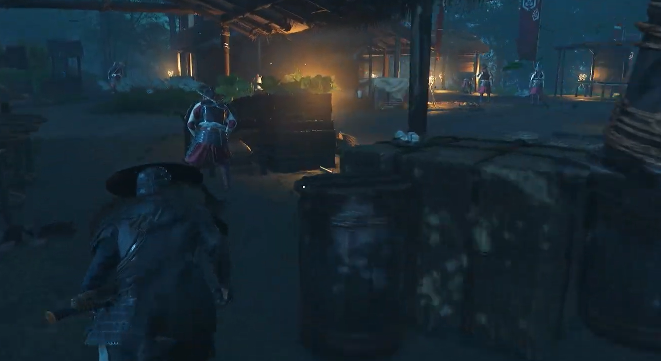 Eliminate or sneak past the first wave of Dragon soldiers patrolling outside the tea house. You may use stealth in tall grass or engage using melee, smoke bombs, and parries.