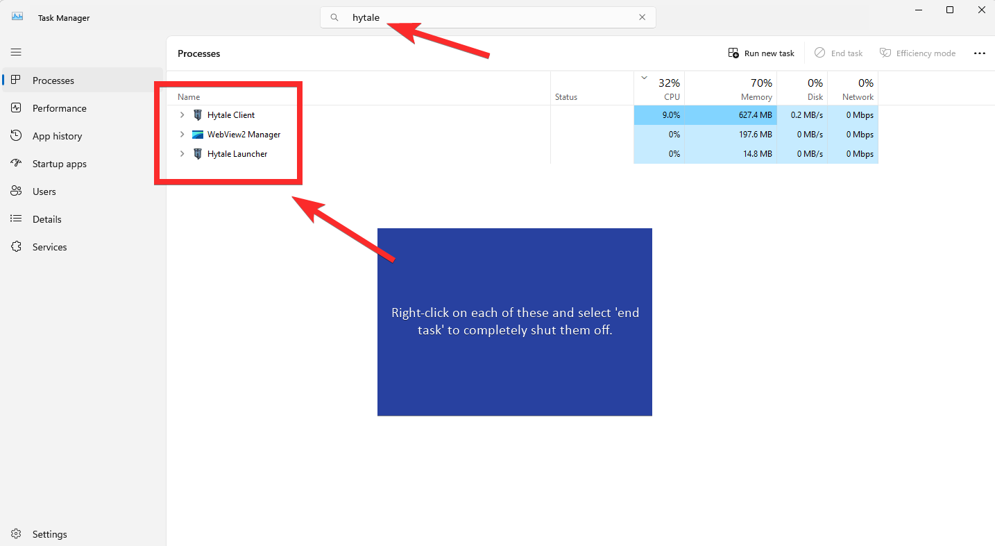 Open Task manager and close all Hytale related processes