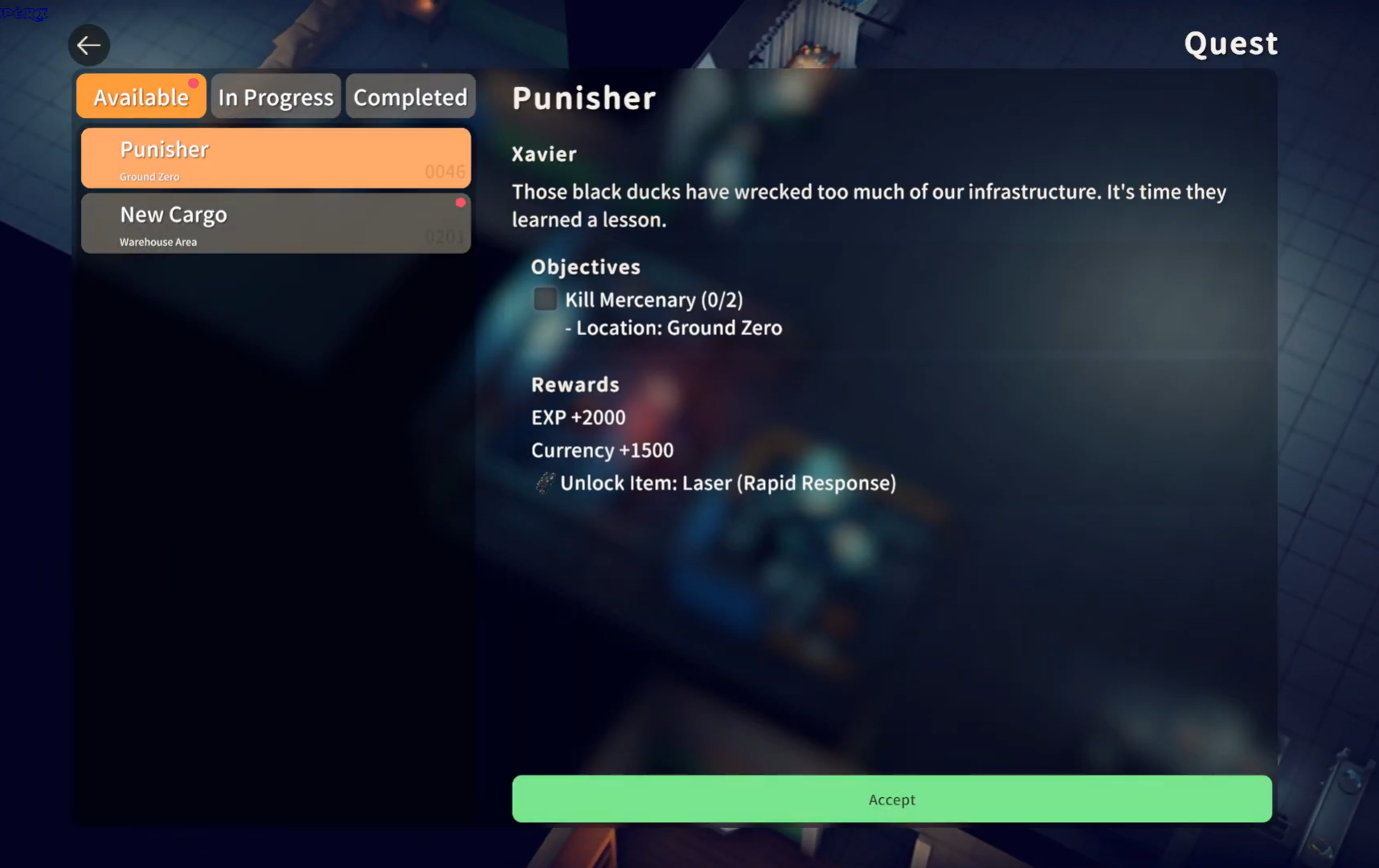 The Punisher quest is given by Xavier in the Ground Zero area. Completing it rewards you with experience points, currency, and a new unlockable item—Laser (Rapid Response).
