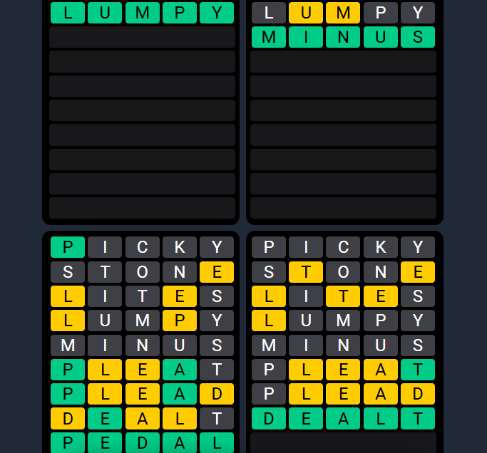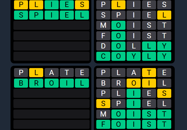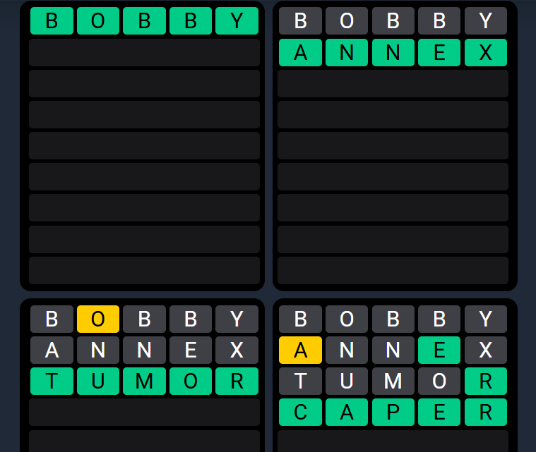 Don’t focus on one grid. Use shared letters that appear across multiple puzzles. - Prioritize greens and shared yellows: