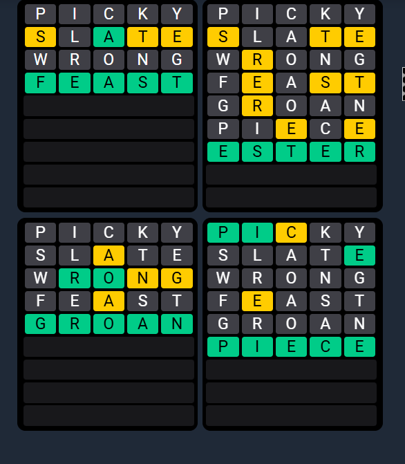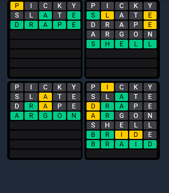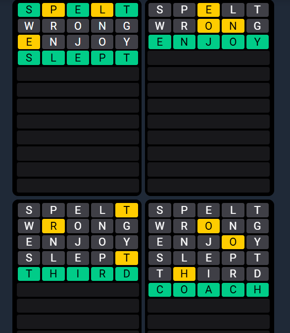 Don’t focus on one grid. Use shared letters that appear across multiple puzzles. - Prioritize greens and shared yellows: