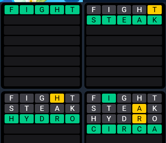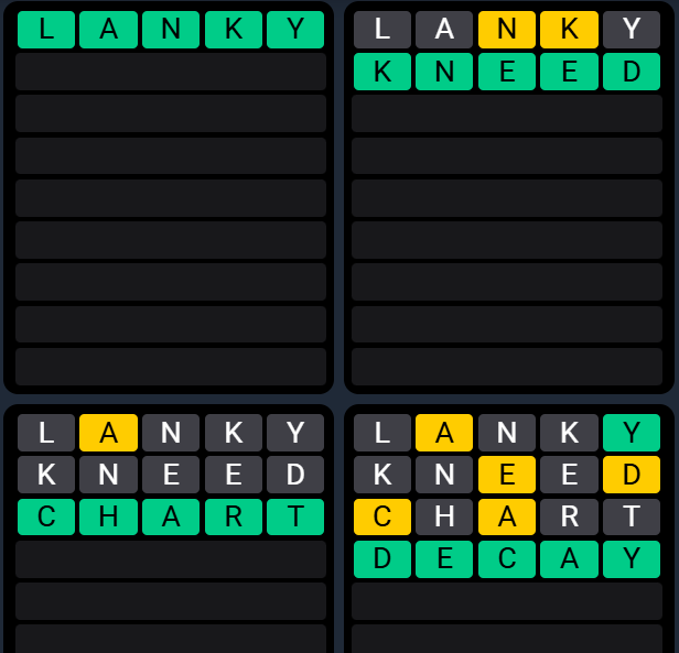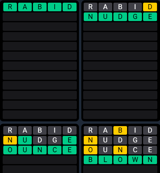 Don’t focus on one grid. Use shared letters that appear across multiple puzzles. - Prioritize greens and shared yellows: