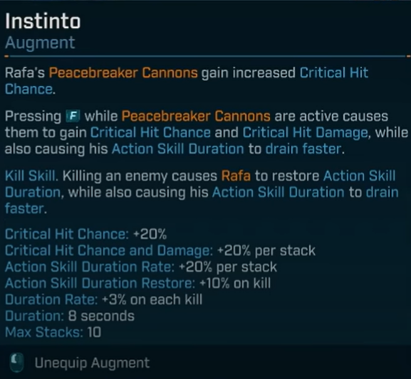 Ricochet is Rafa’s signature mechanic. Critical hits bounce into nearby targets, multiplying your damage output far beyond a single shot. Skills like Instinto and augments like Double-Ought Autoshot ensure that both your weapons and Peacebreaker Cannons benefit. With enough ricochet sources, mobs melt in seconds and bosses suffer constant crit chains.