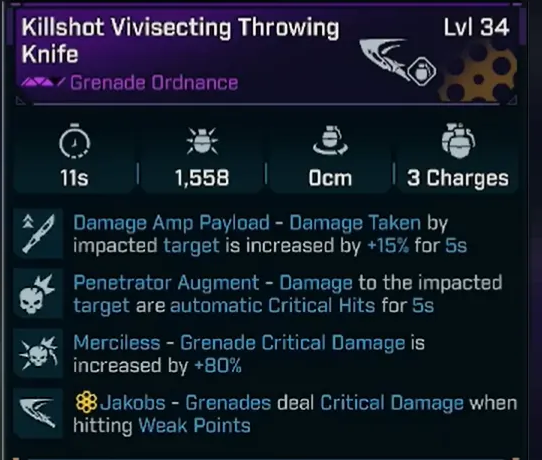 Vivisecting Throwing Knife. High burst ordnance that complements melee/crit setups while filling downtime between cannon deployments.