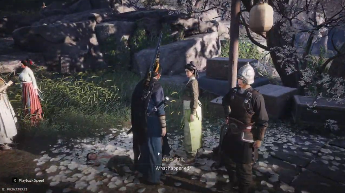 You can start this Wandering Tale at the Laureates Board in the North Imperial Garden. Here, you'll find Mrs. Wu berating her son as he lies on the ground in distress.