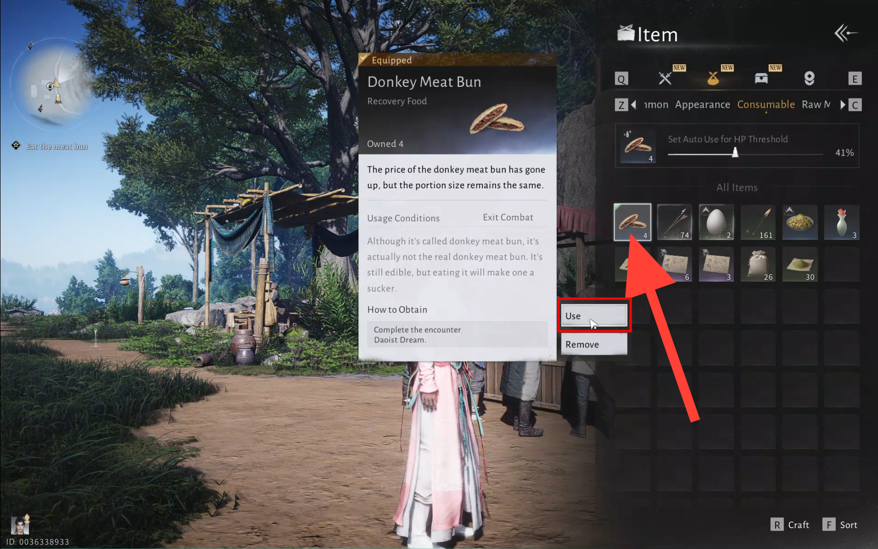 Open the menu and consume the Donkey Meat Bun by pressing use after selecting the bun from the Consumables tab in your Items.