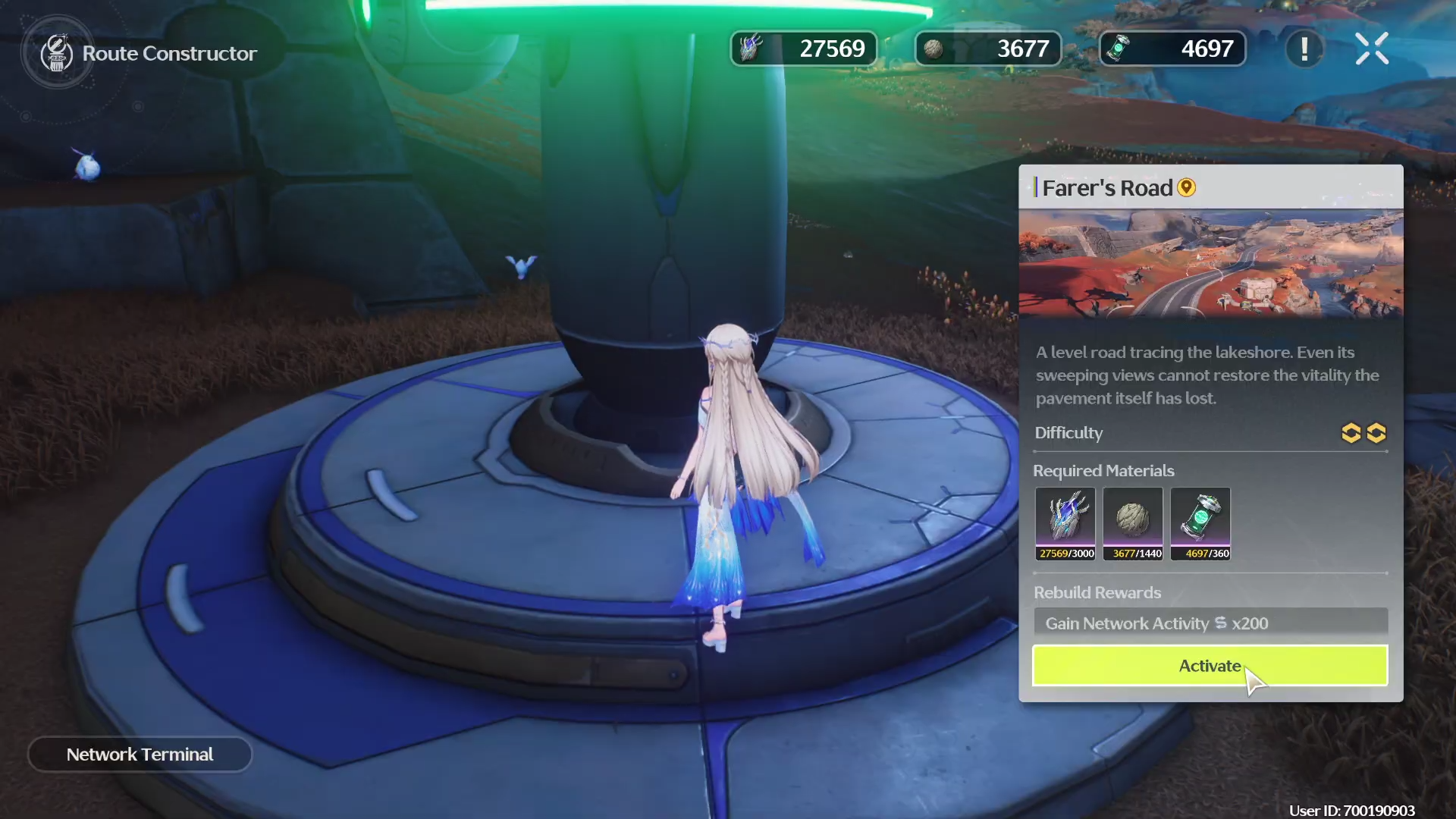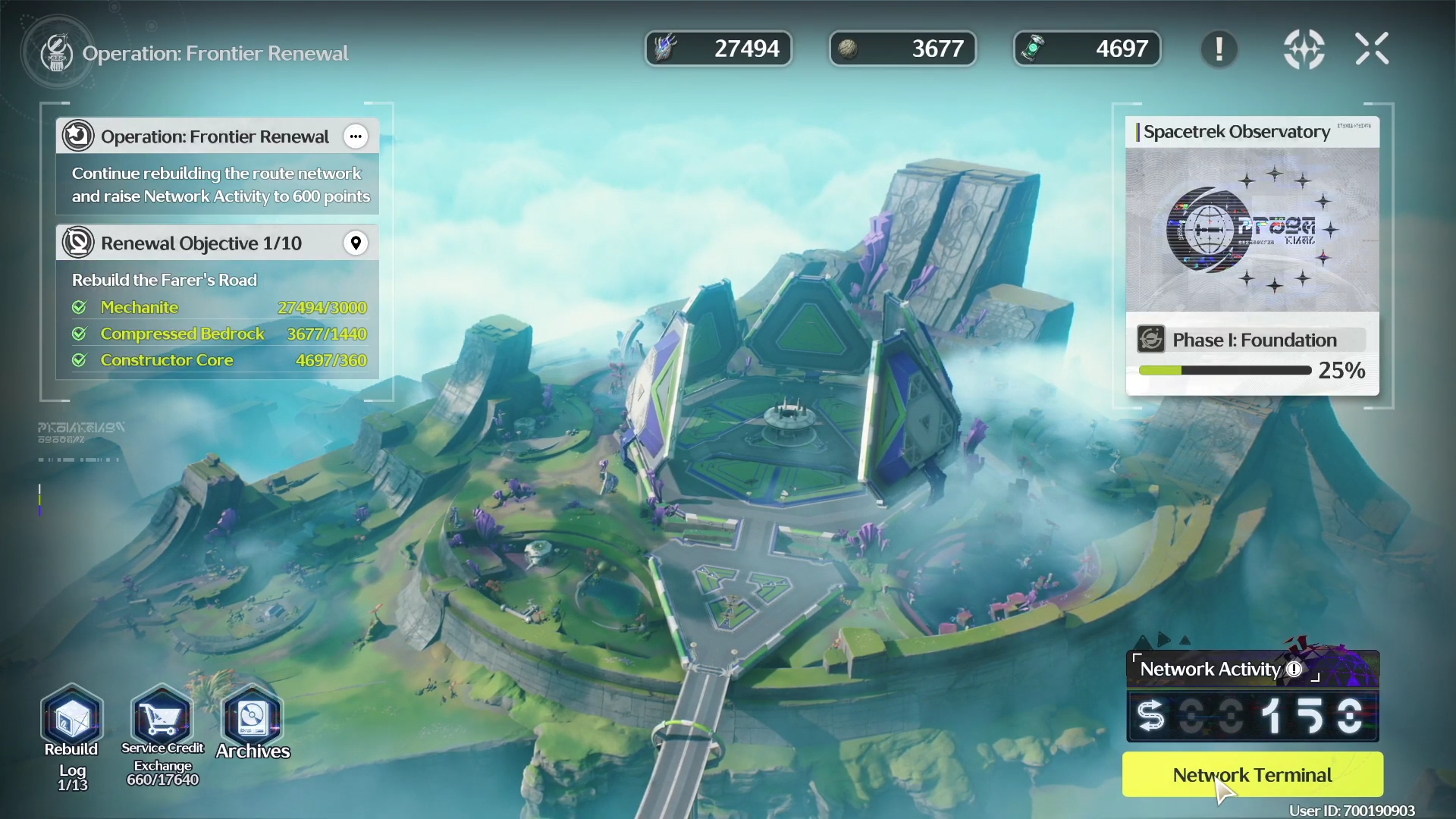 Open the Rebuild Log in the event menu to confirm Farer's Road status and track Network Activity progress.