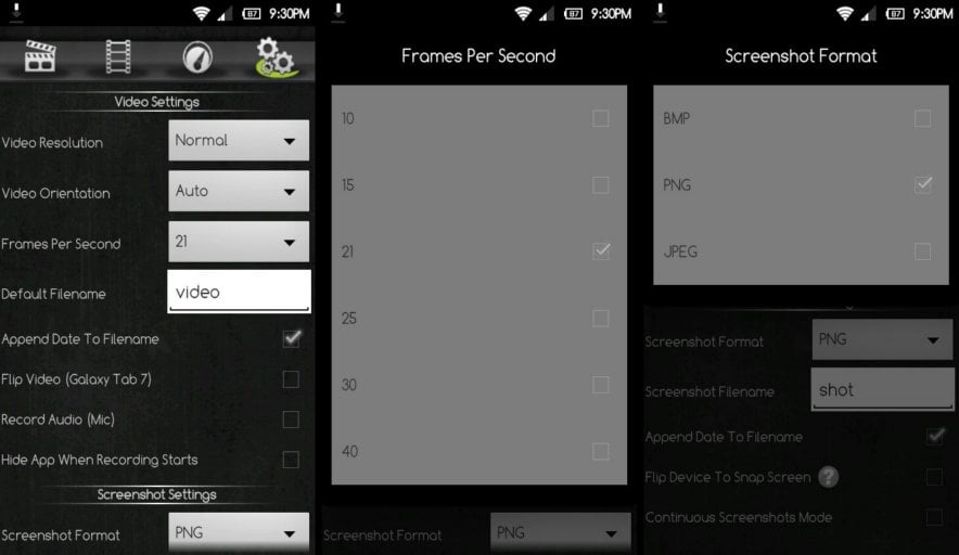 Videos are recorded in MPEG-4 format and run pretty smoothly, and there are a lot of settings you can change, like video resolution, frames per second (from as low as 10 to as high as 40 frames per second), video orientation, and also disable or enable audio recording. High resolution looks quite good, but slows down things and is more suited for dual core phones. Normal resolution takes care of that by providing both smooth frame-rates and good quality. You can either start video recording from the app itself or, if you get the paid version, you can add a widget to the homescreen to start recordings as well.