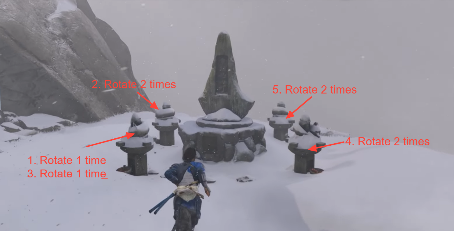 | Puzzle type | Light hearths, then rotate wolf statues to face the hearth / rock center |