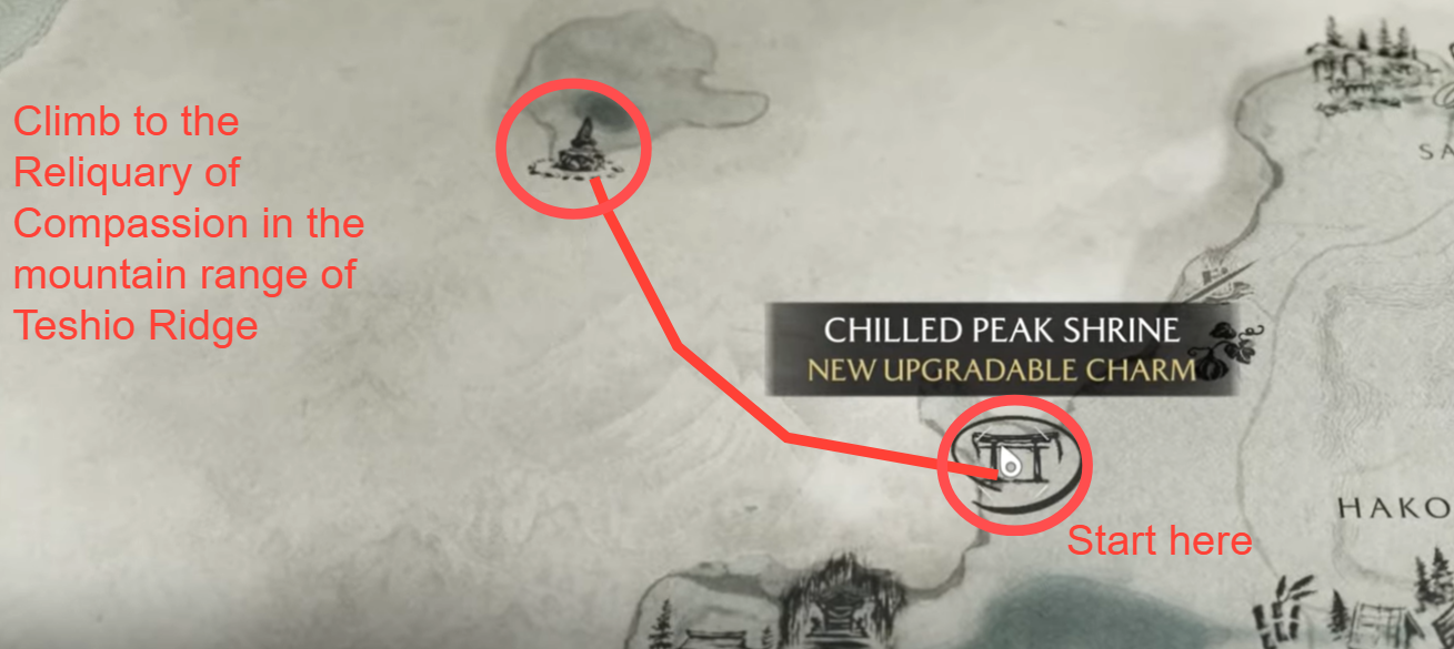 The Reliquary of Compassion awaits near the summit of Chilled Peak Shrine, located in the northwest sector of Teshio Ridge. Start your ascent from the shrine entrance north of Sarobetsu Lake. The path involves scaling icy walls, using campfires for warmth, and veering left at a frozen lake to eventually reach a narrow passage leading directly to the reliquary.