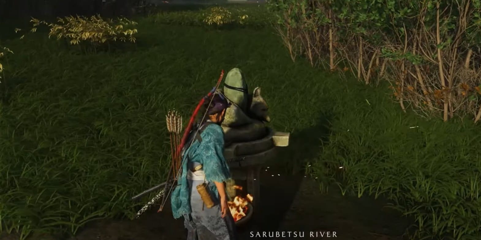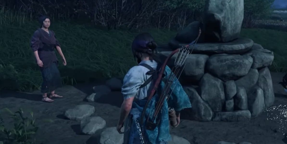 To find this puzzle, head into the Yotei Grasslands region of the map, specifically west of the Shadow of Yotei Inn and across the Sarubetsu River. Look for a curved riverbank near the northwestern arm of the river. As you approach, a golden bird may guide you to the exact location. A woman near the statue can share some local folklore if you stop to talk.