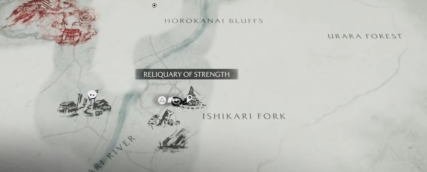 You’ll find this reliquary in the Ishikari Plain, a serene yet treacherous region bordered by rivers and cliffs. Head northeast of the Ishikari Fork and climb a low ridge to spot the reliquary embedded in stone terraces. It’s visible from afar, illuminated faintly by sunlight refracting off the river. If you encounter an NPC guarding the site, talk to them for hints about the “demons in masks.”