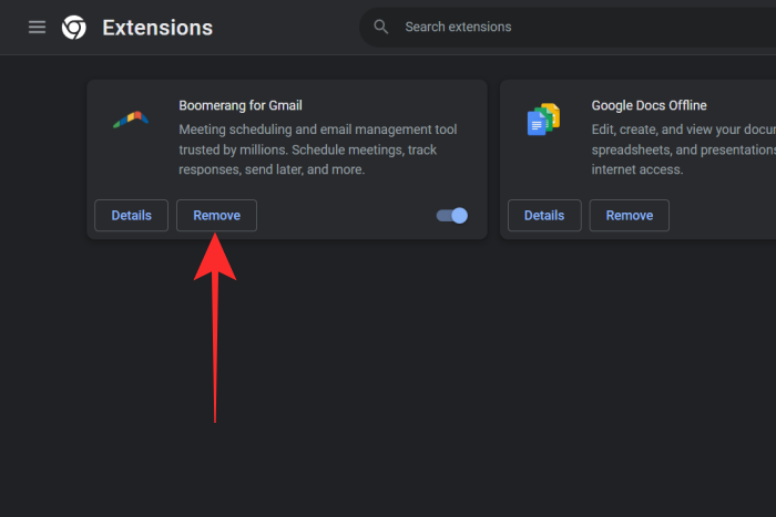 On the Extensions screen, locate the Boomerang for Gmail extension and then click on Remove.