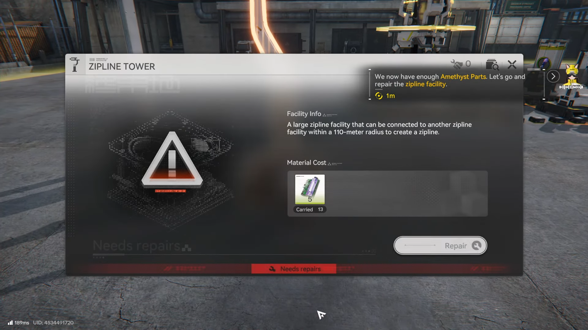 Zipline Tower repairs typically work like other world-object repairs: have the required Parts in inventory, interact with the structure, and confirm the spend.