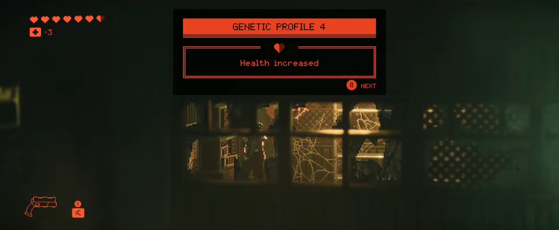From Scan #25, climb and use the pickaxe hang to reach a side door on the left, then follow the corridor to a health upgrade.