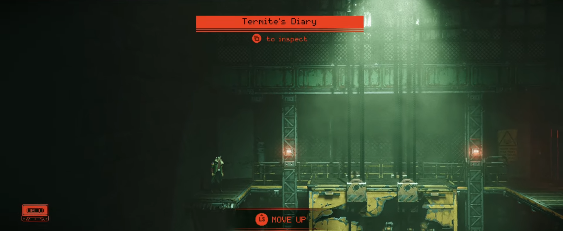 After riding the cargo elevator and climbing to the top left of the vertical area, scan the diary near the machinery.