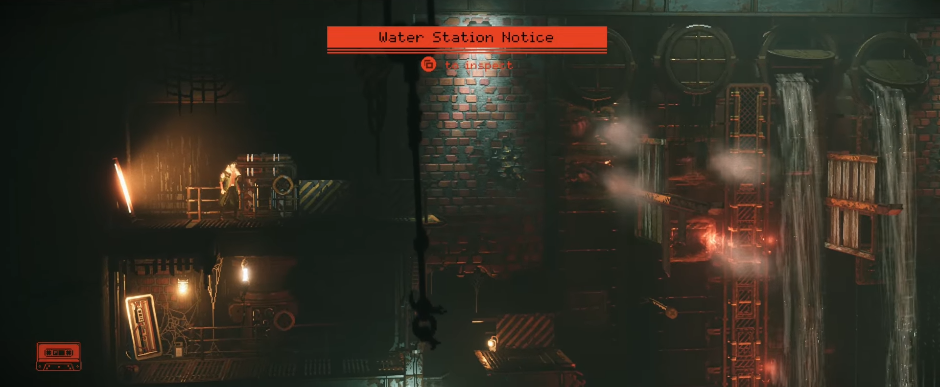 In the valve‑puzzle area, climb to the top left using the pickaxe latch points and scan the notice.