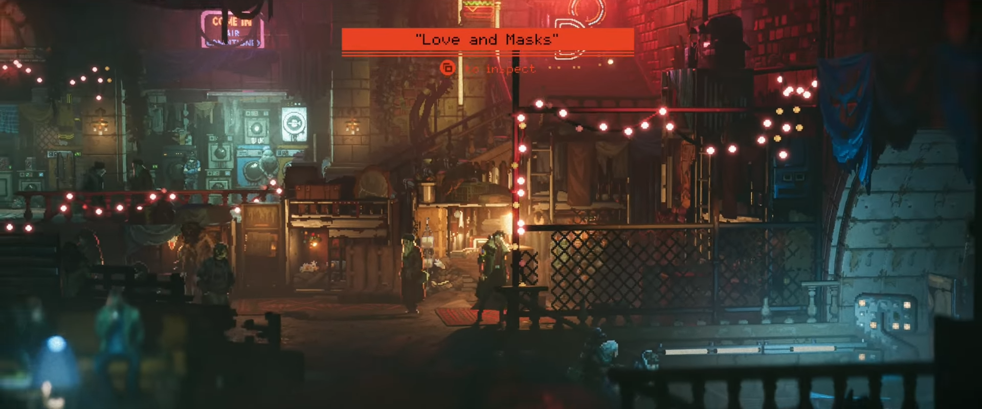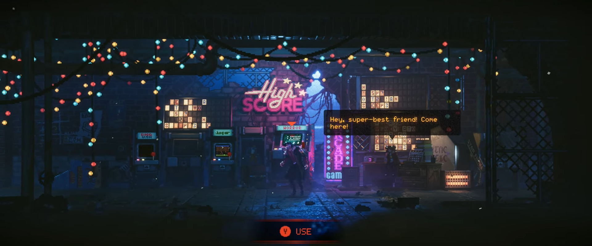 Inside the arcade, at the far end of the room.