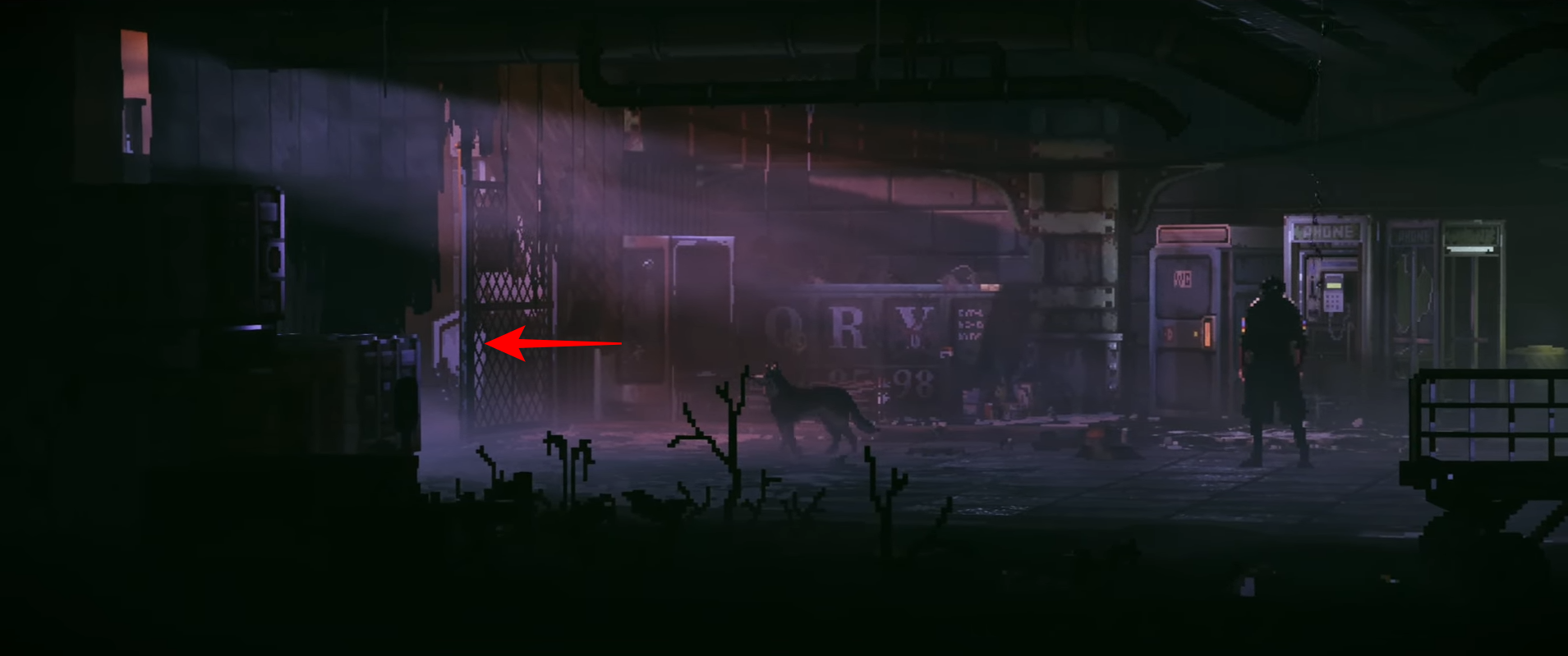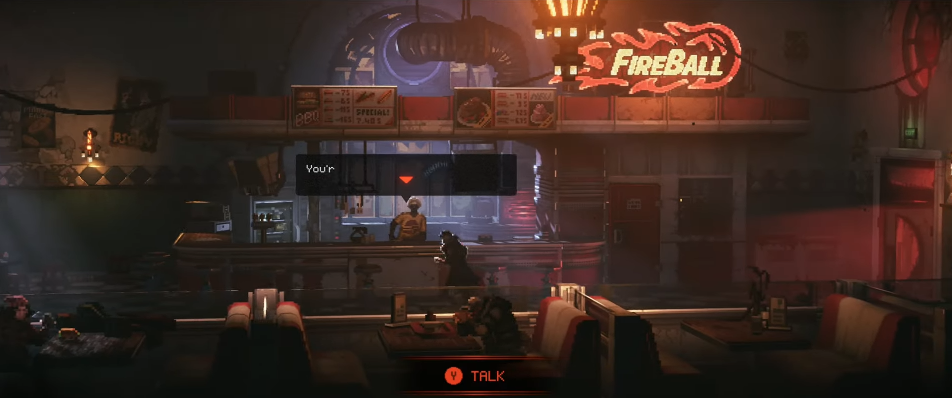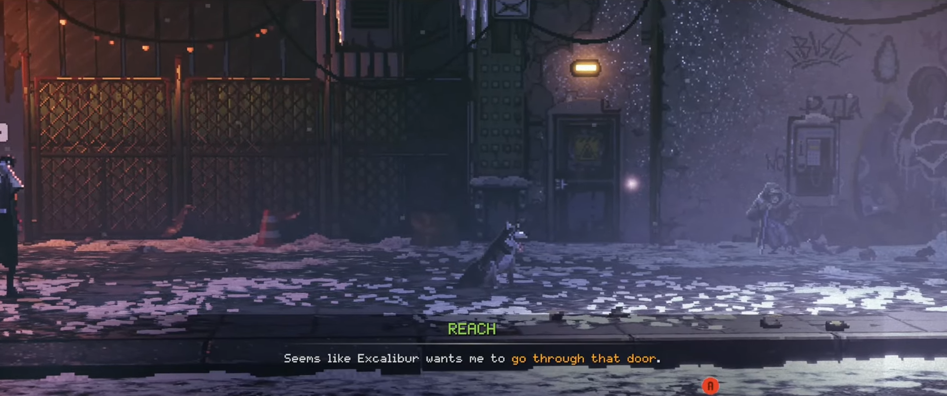 After the burger exchange, Excalibur will begin to move toward a side corridor or service hatch that leads underground.