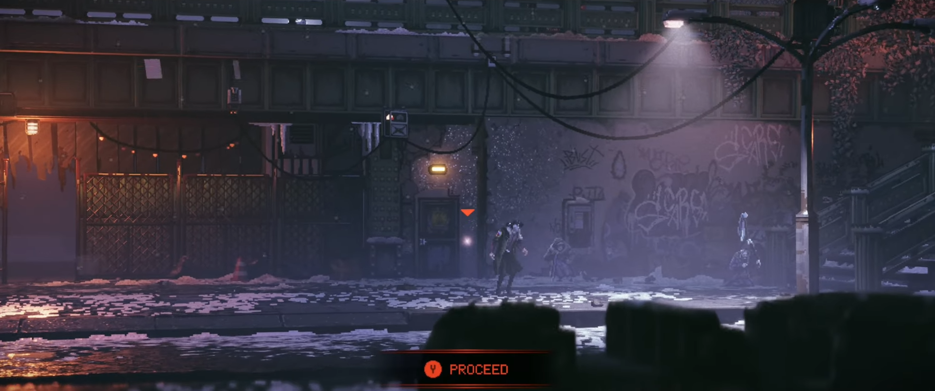 Proceed through the door.