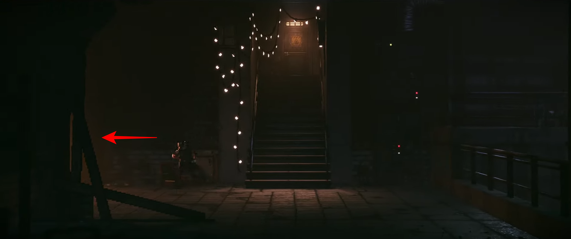 From the bottom of the stairs, go left.