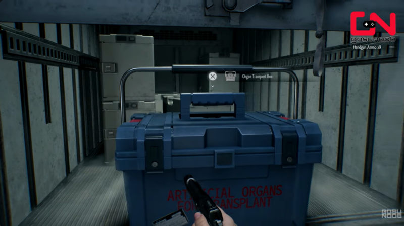 The Organ Transport Box is located in the garage section of the Care Center. Approach the Organ Transport Box in the garage and interact with it. Switch the control mode to “Hand” mode using the D-pad input.