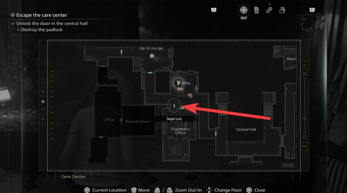 The Simple Lock is inside the Chairman’s Office within the Care Center section of the map. It appears as a locked drawer near the office entrance. You’ll likely encounter it while navigating between the Gallery and Central Hall areas as part of the broader objective to unlock the central hall door.