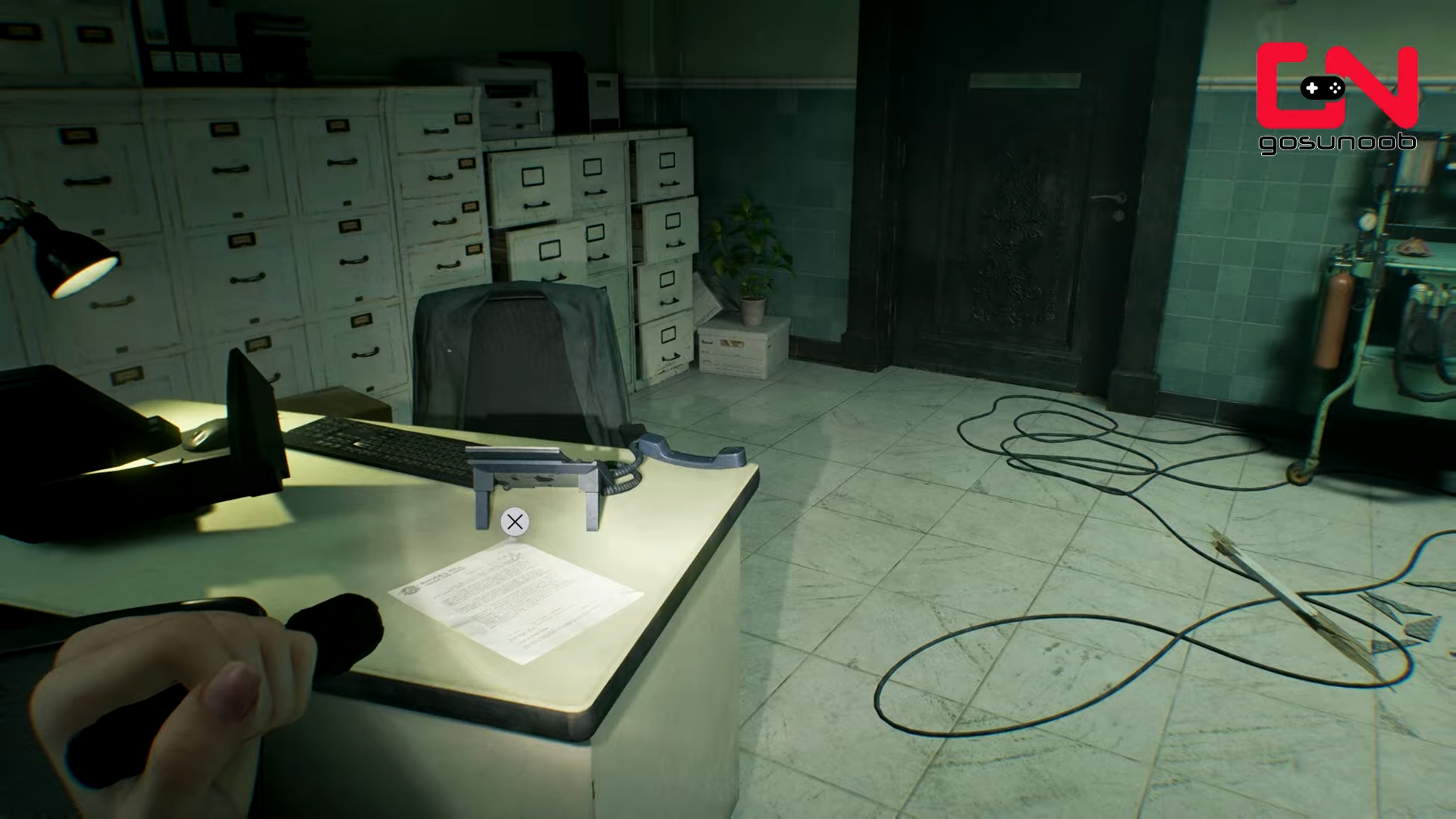 - Proceed to the office door and enter.