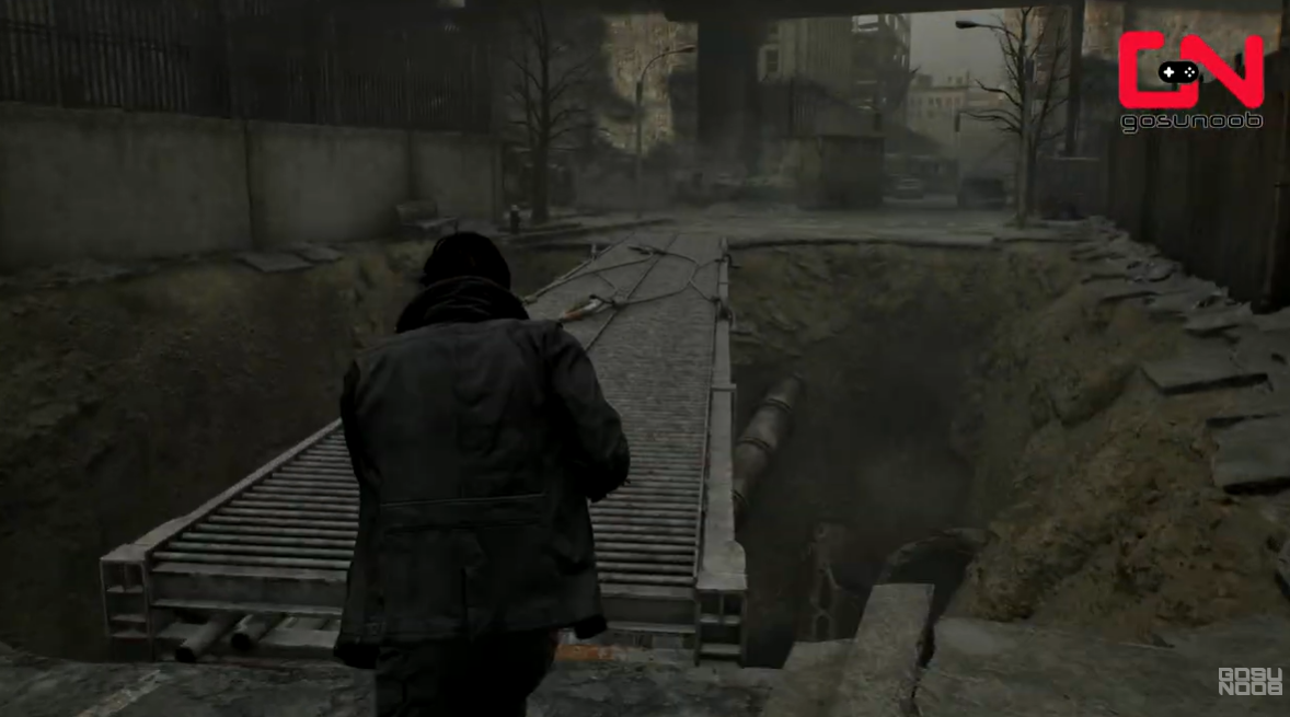 Advance through the Raccoon City streets until you reach a downward-sloping highway filled with wrecked vehicles.