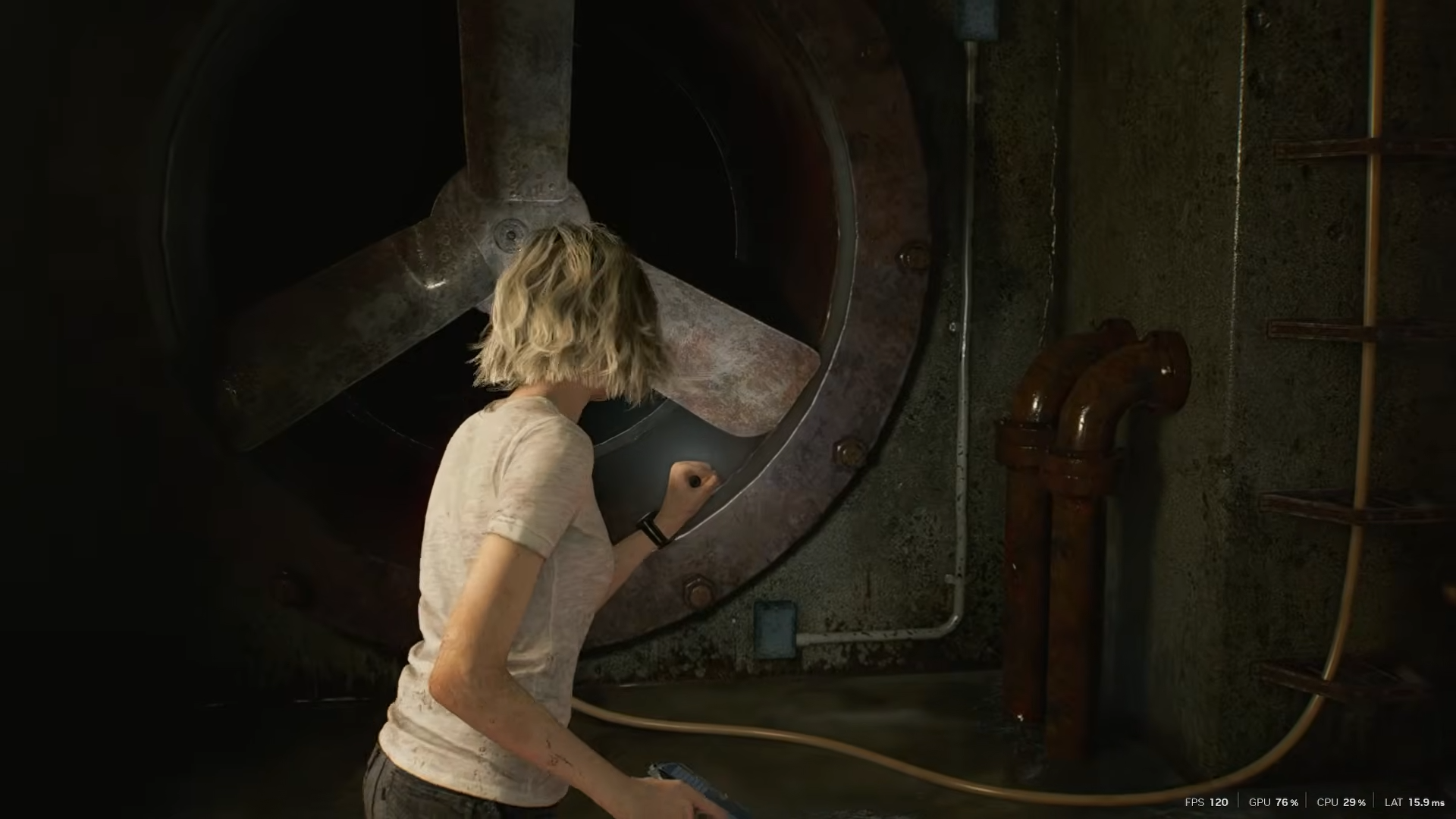 Proceed west linearly, crouch through the now-deactivated fan into the Processing room with its blood pool.