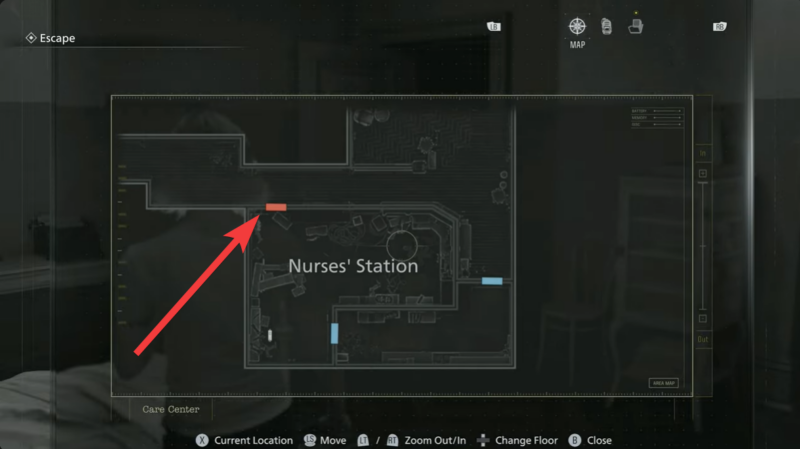 Inside the Nurse’s Station, you’ll find a movable table positioned beneath an upper ledge. This table is not decorative. It is interactive and essential for reaching the hidden item.