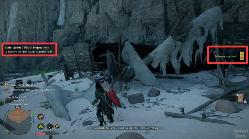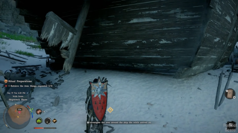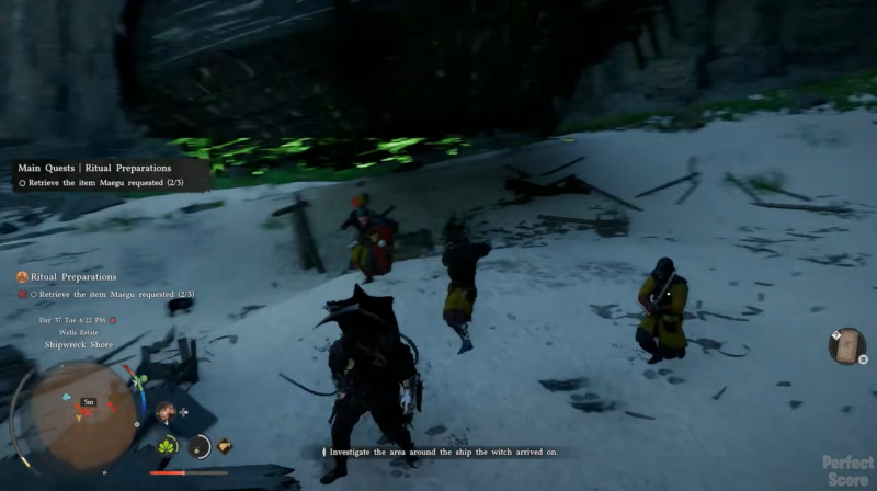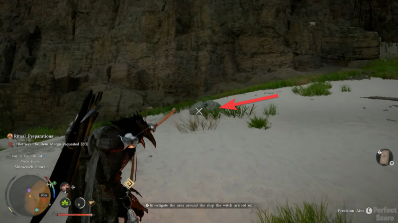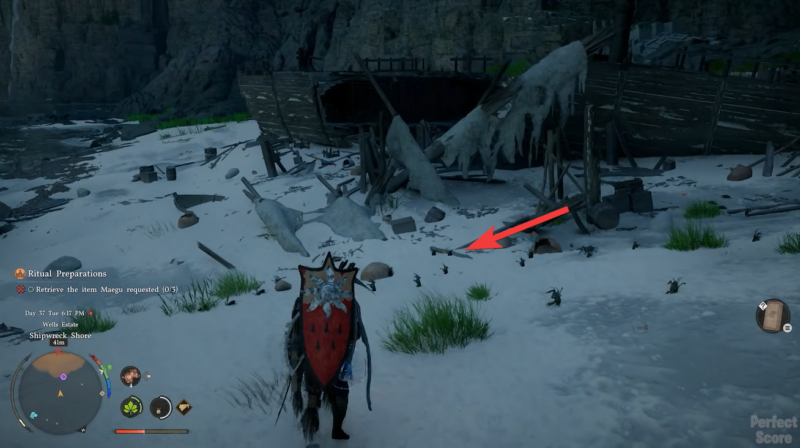 The terrain is uneven and cluttered, so careful exploration is key. You’ll notice broken ships, logs, and stone formations—each hinting at where the ritual items are hidden. While the area isn’t overly dangerous, enemy ambushes can occur during interactions, especially when manipulating objects.