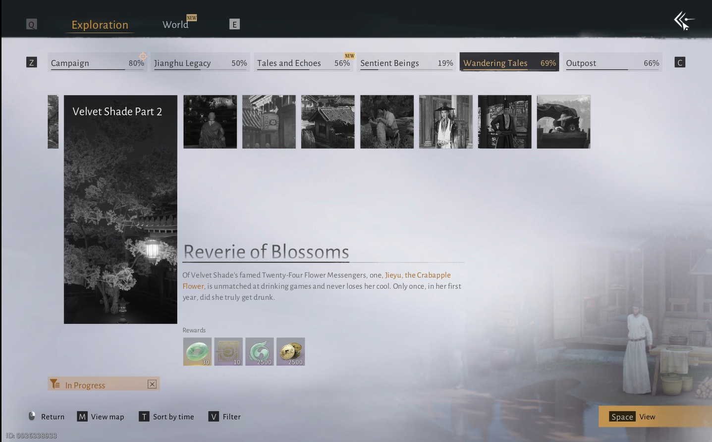 Reverie of Blossoms is a romantic, story-driven Wandering Tale that follows Hua Jieyu - one of Velvet Shade’s renowned Twenty-Four Flower Messengers. Known as the Crabapple Flower, she’s famous for winning drinking games and never losing her composure. This tale unfolds as you continuously miss her, receiving hints from locals until you finally reunite under a jade tree for a dreamlike ending.