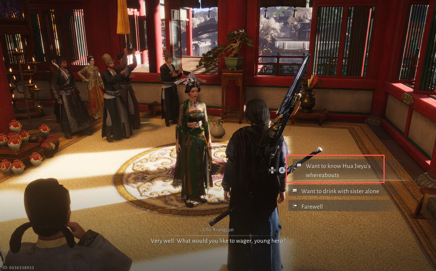 Enter Revelry Hall and speak with Chu Xiangjun, who is playing pitch-pot. Ask about Jieyu’s whereabouts. She informs you that Jieyu invited you to meet her in the third-floor side room.