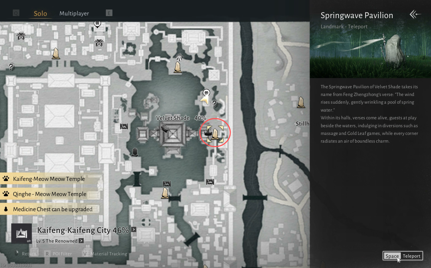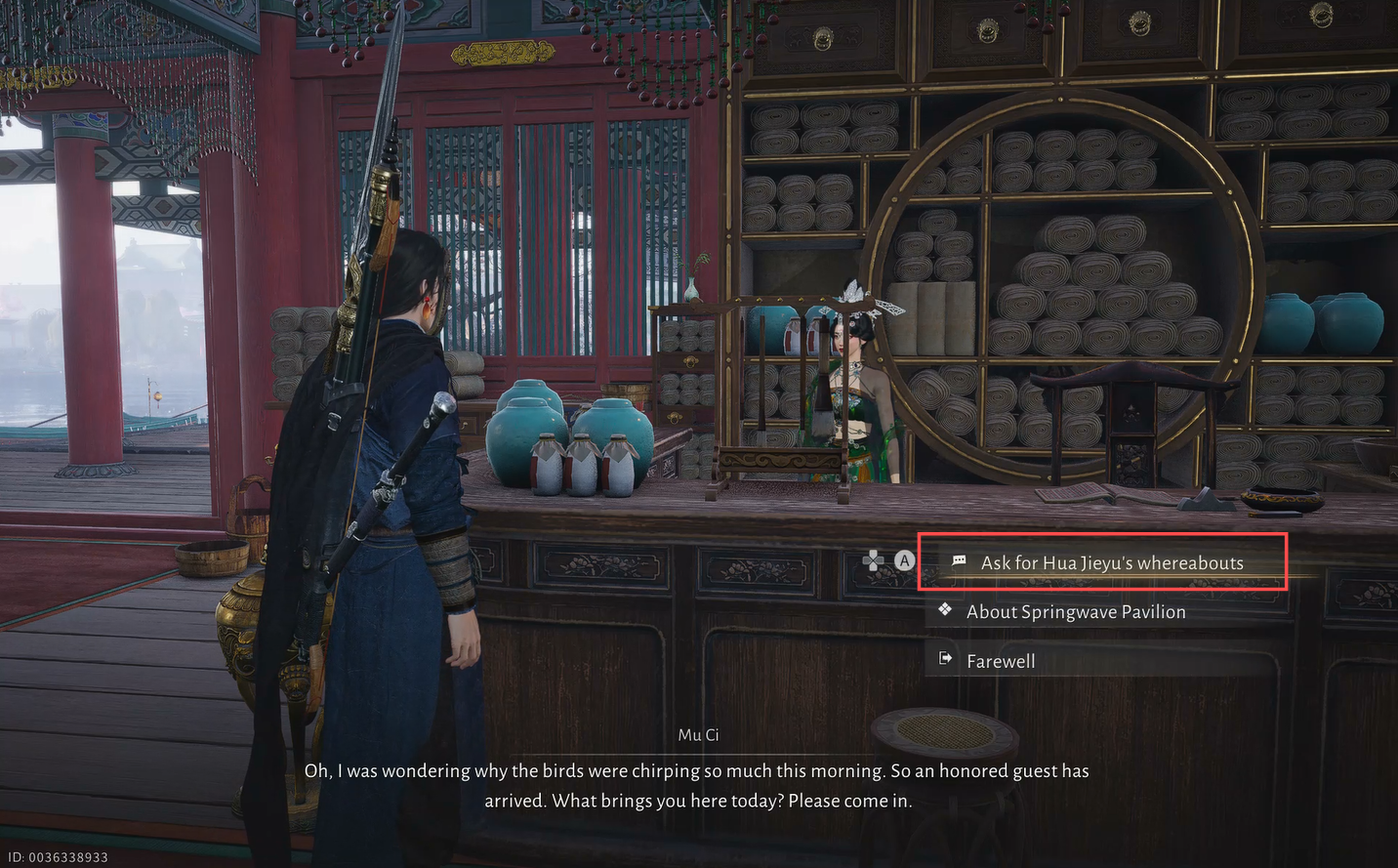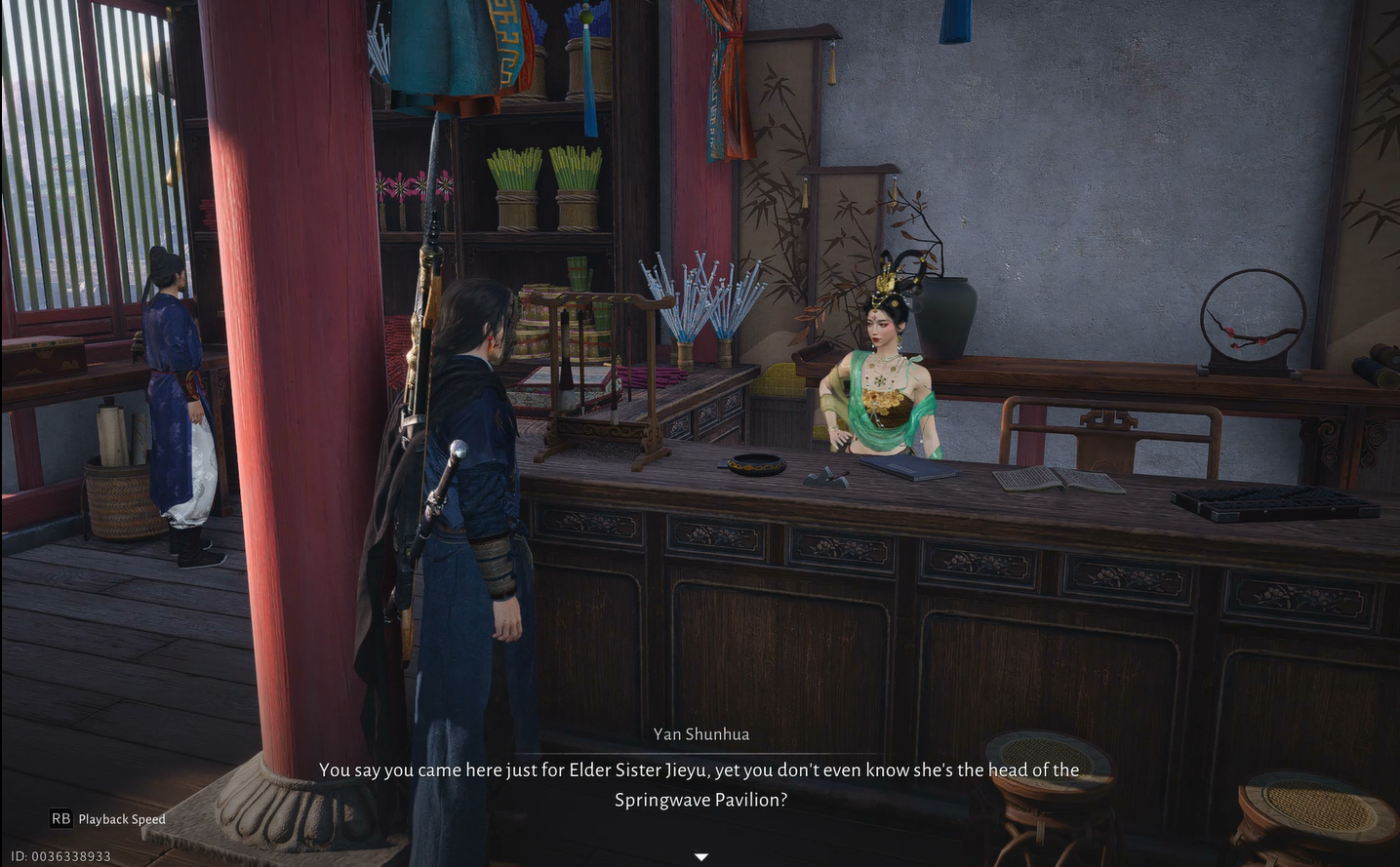 Speak to Yan Shunhua there. She tells you that you’ve just missed Jieyu again and advises you to follow the trail to Springwater Pavilion.