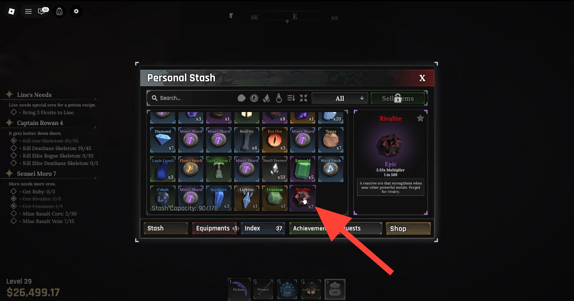 Rivalite is an Epic Ore found in the Forgotten Kingdom, obtainable by mining Basalt Veins or Volcanic Rock at a very rare 1/569 drop chance. This red-and-black mineral is known for its striking appearance and its ability to “rival” other ores. When forged into weapons or armor, it gives them a distinct red-and-black finish, making it both powerful and visually unique.