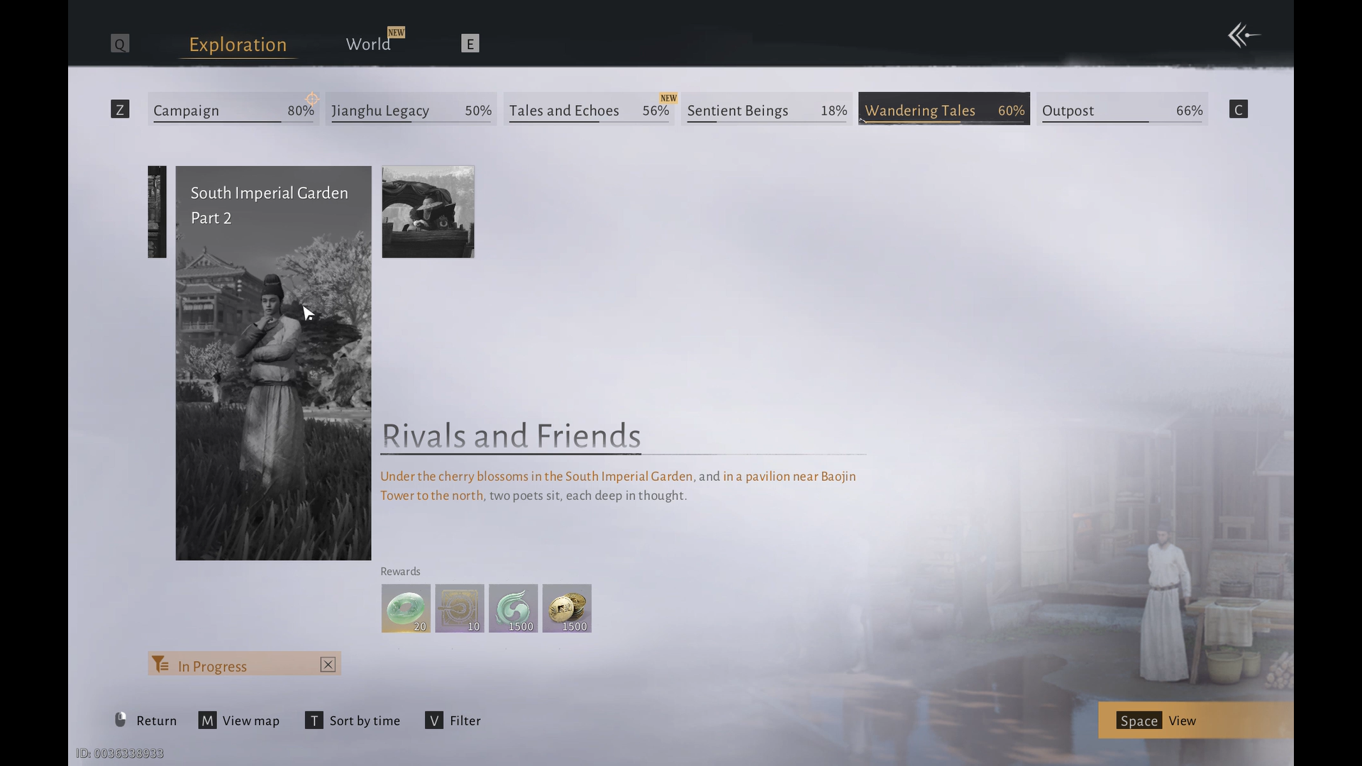 Rivals and Friends is an emotional and artistic Wandering Tale located in the South Imperial Garden near Baijon Tower. This quest follows two poets, Wen Jinyu and Gai Yangshu, who are caught between rivalry and mutual admiration. By collecting items, painting cherry blossoms, and bridging misunderstandings, you help restore their friendship.