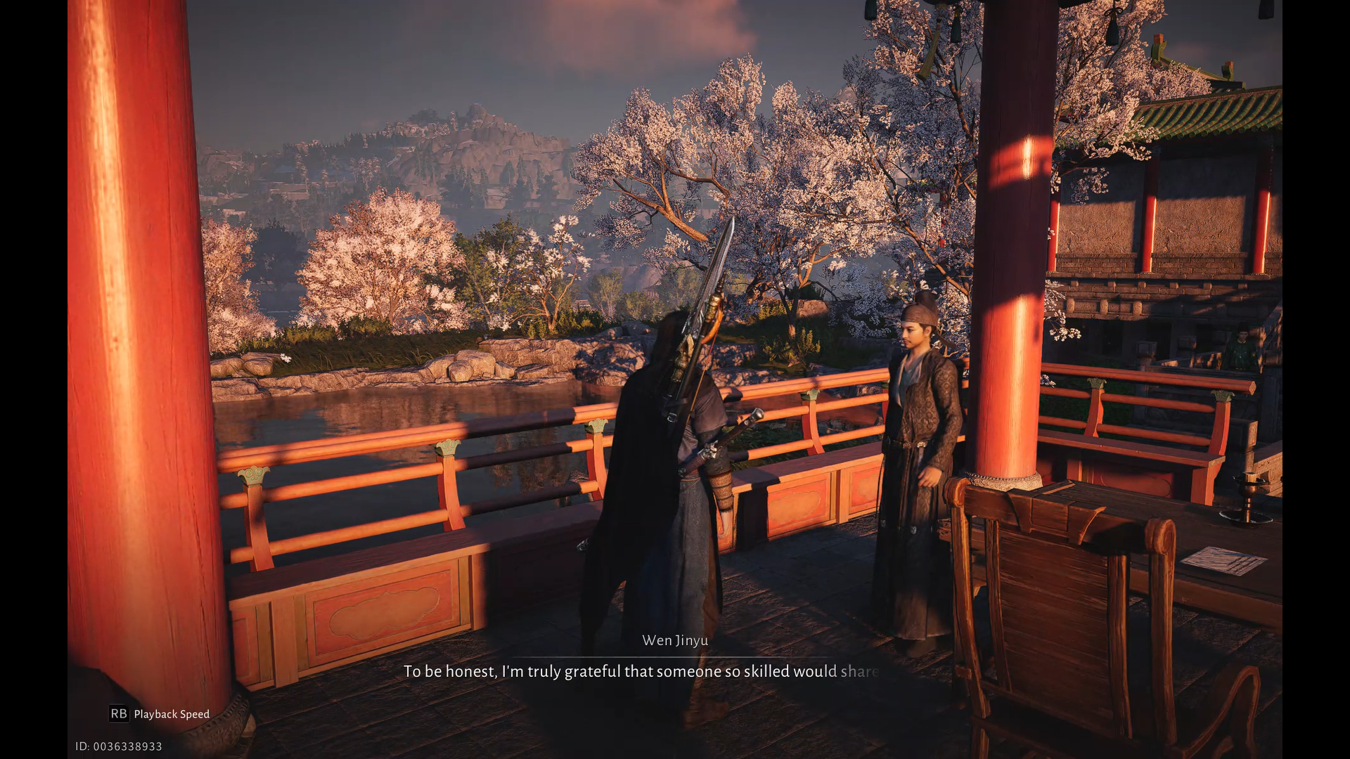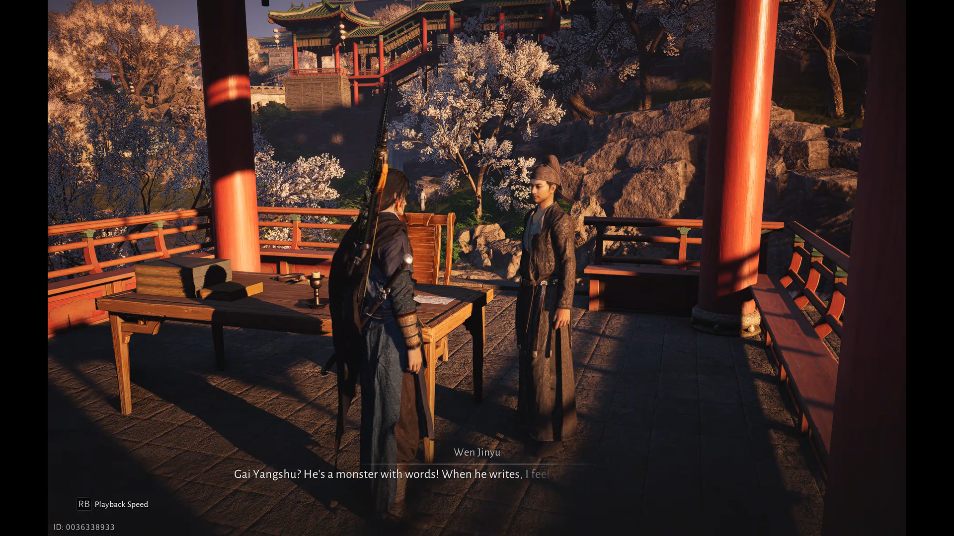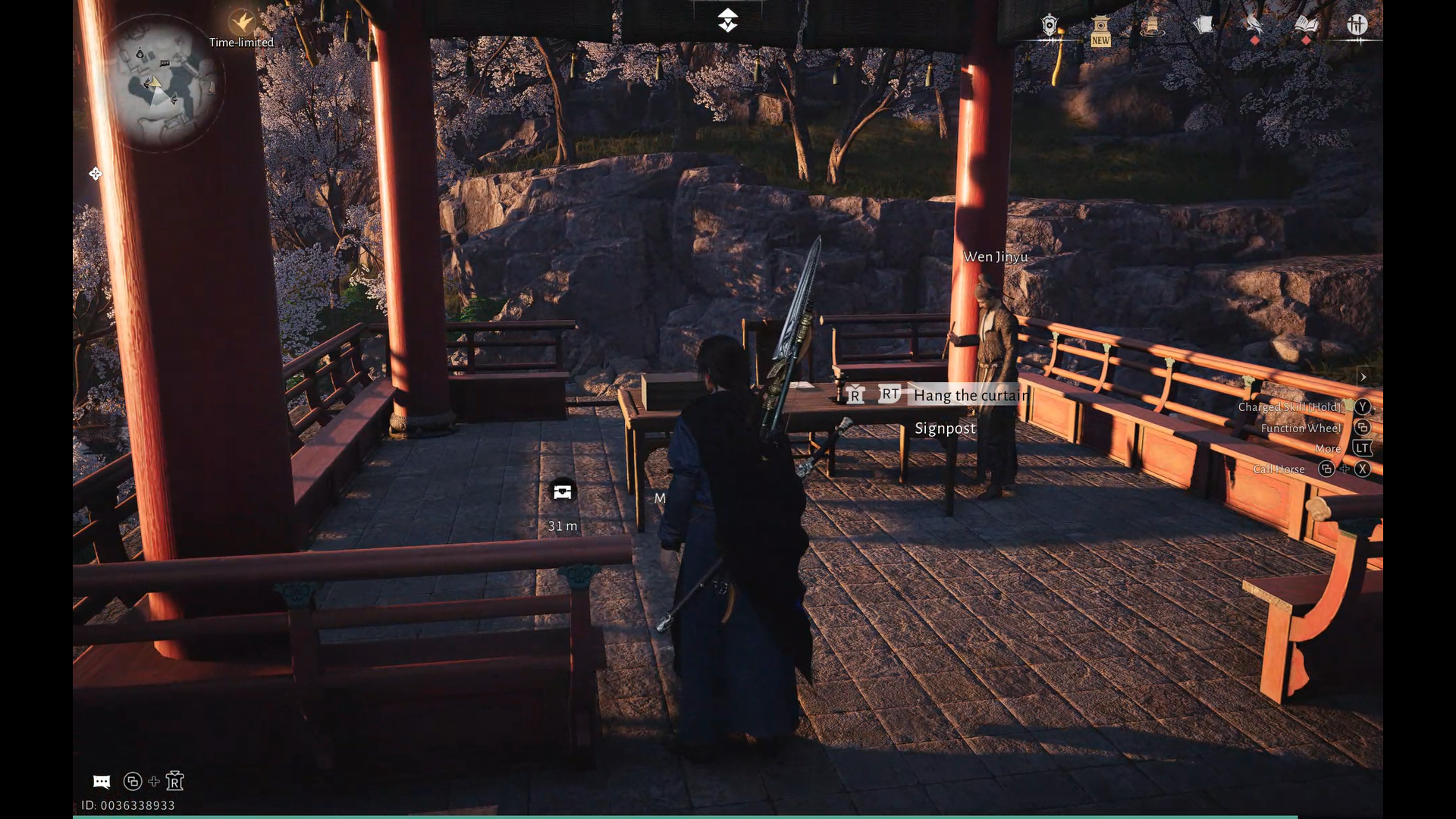 Wen Jinyu's pavilion has a prompt to hang the curatain. On selecting it, a cutscene showing both poets side by side is triggered.