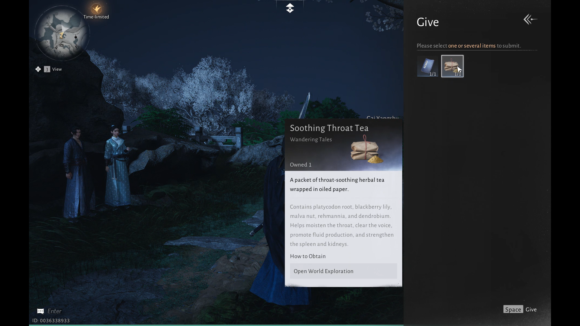 Meet Gai Yangshu and give him both items one by one - Soothing Throat Tea and Cherry Blossom Painting.