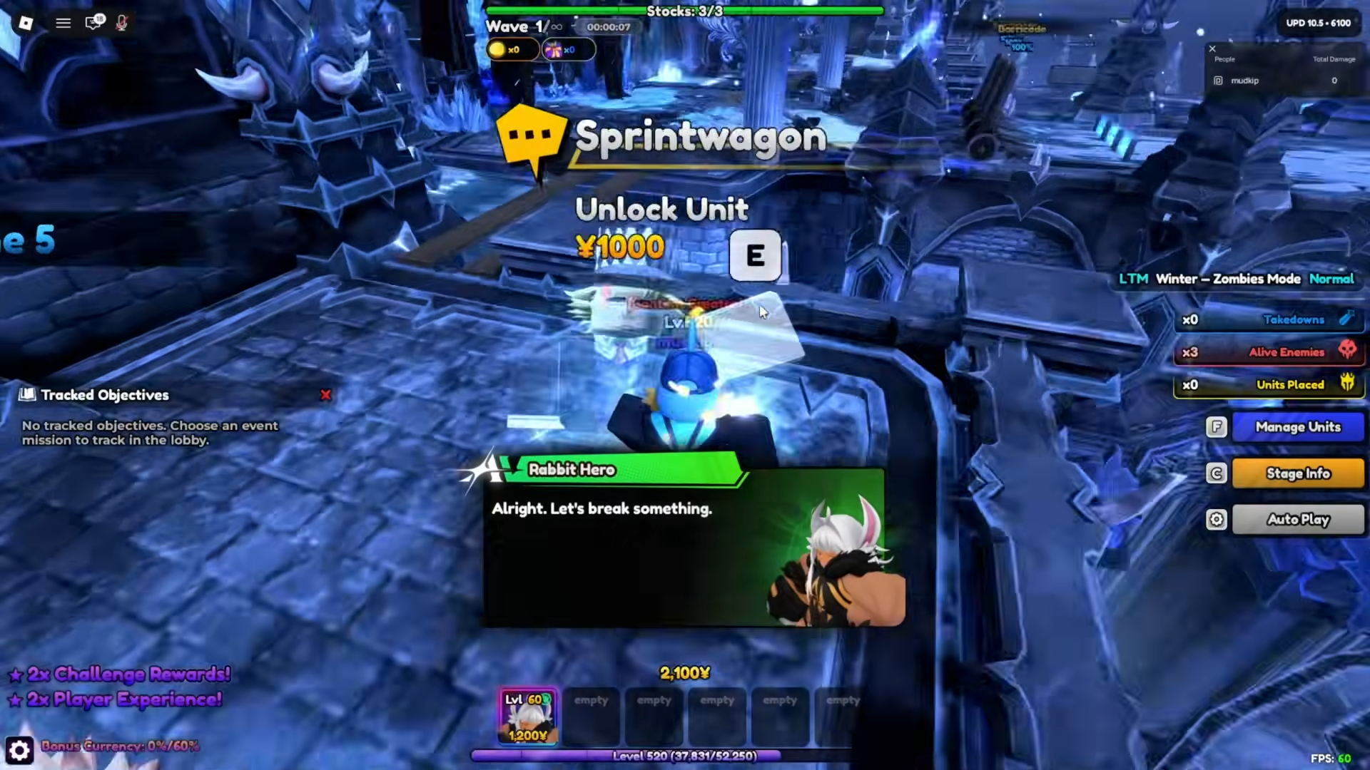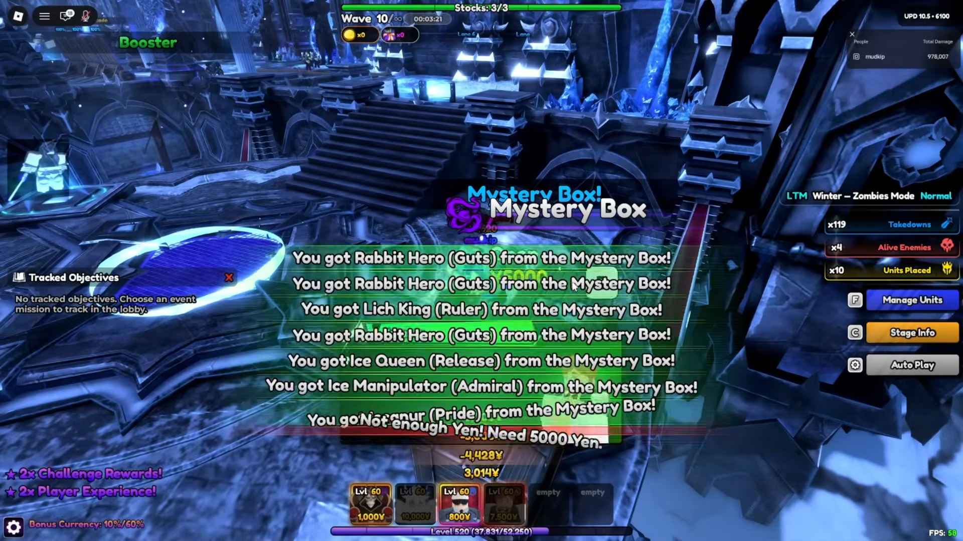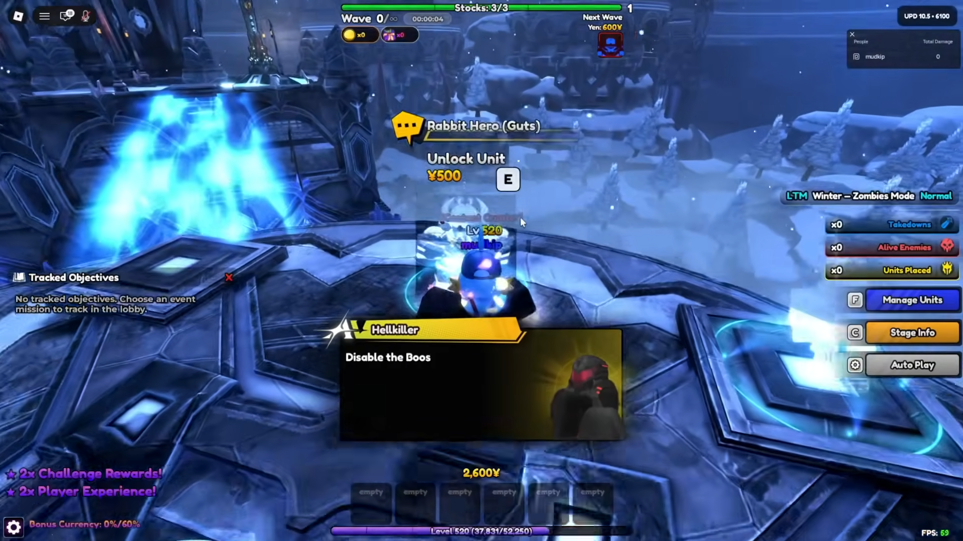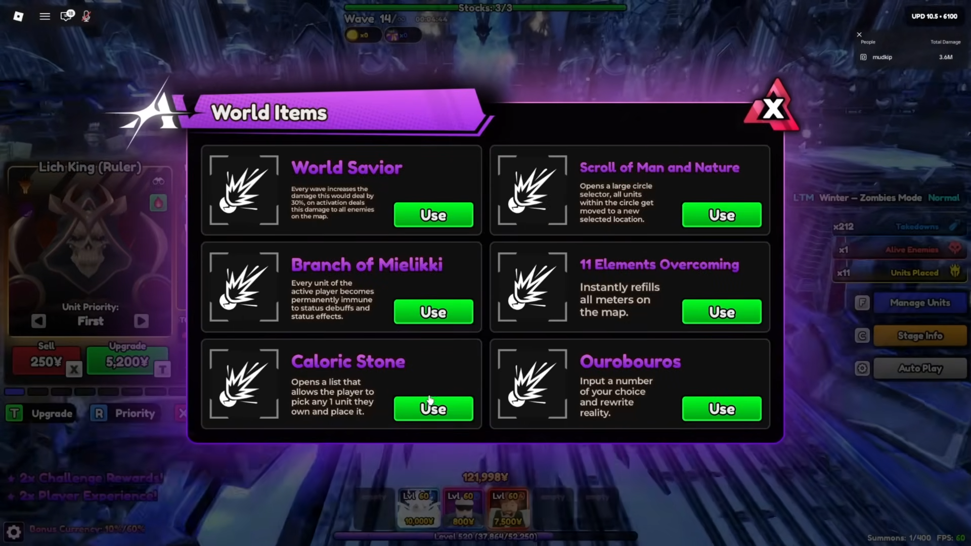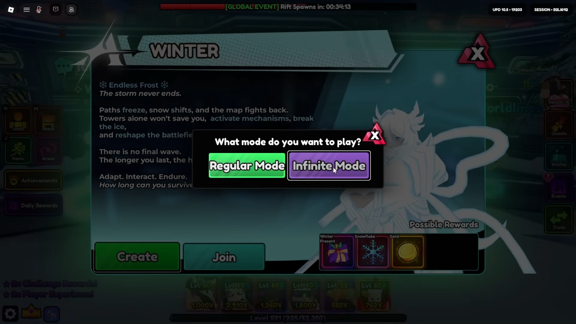 You will mainly interact with the Winter Event menu for Regular and Infinite runs, plus in-match spots like the rabbit girl vendor area, speed cart pickups, the gate where you stack units for fast kills, the mystery box area, the Monarch machine, and the world items menu for Caloric Stone.