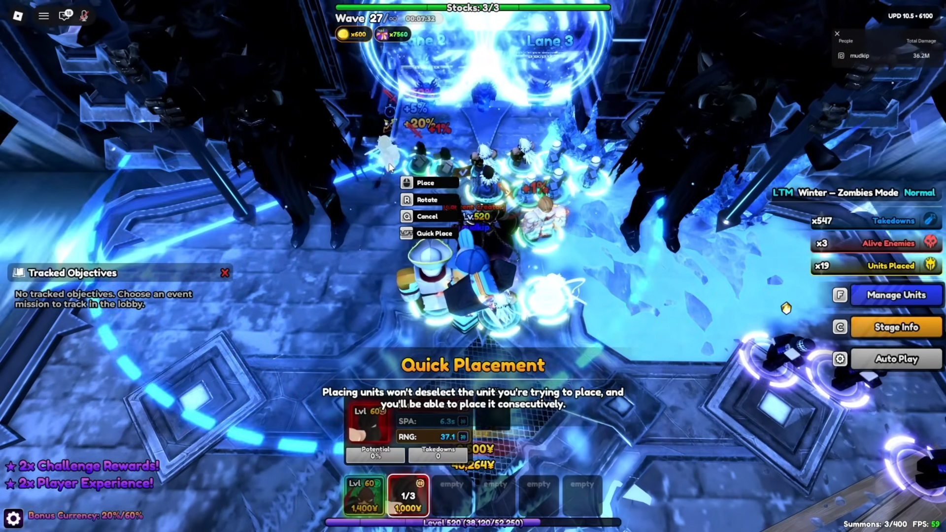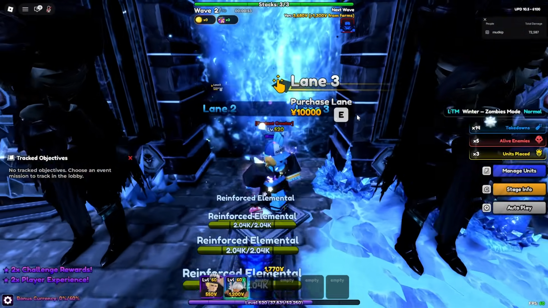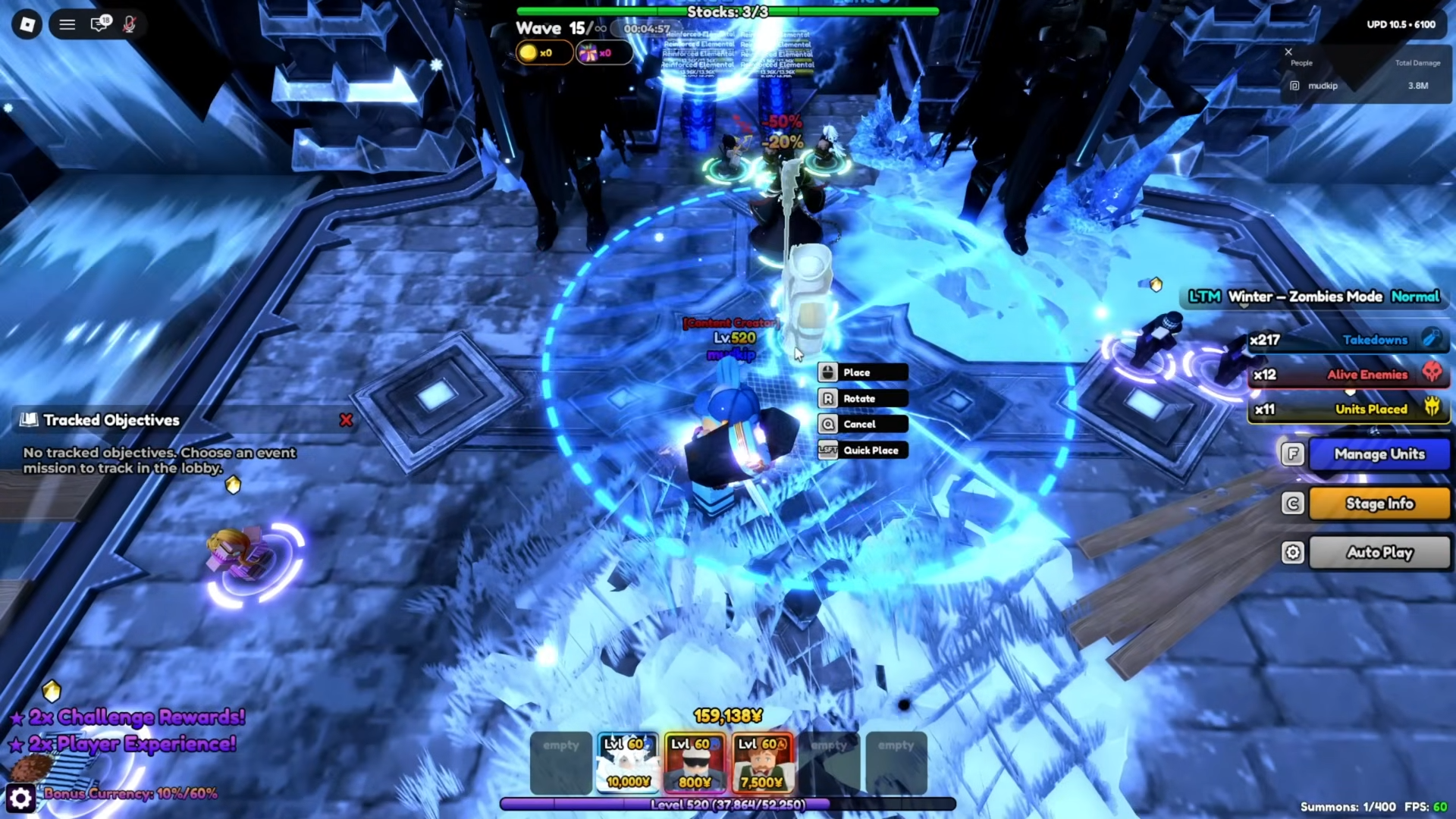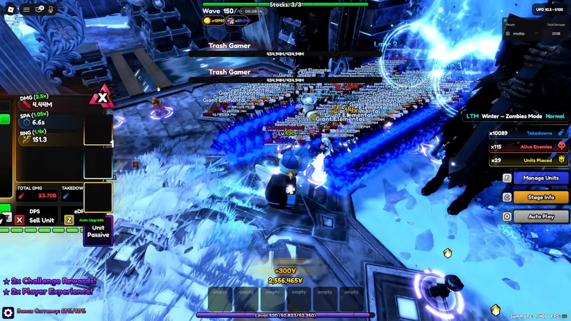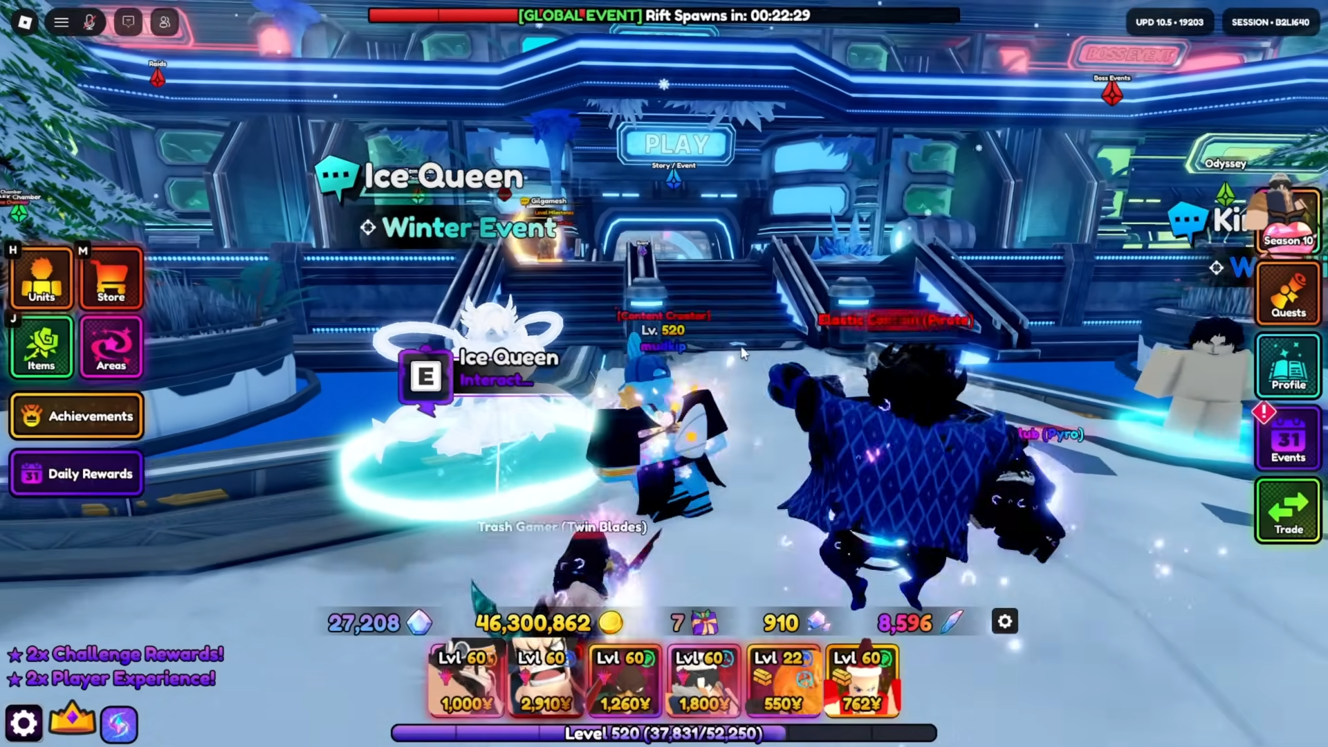 You will mainly interact with the Winter Event menu for Regular and Infinite runs, plus in-match spots like the rabbit girl vendor area, speed cart pickups, the gate where you stack units for fast kills, the mystery box area, the Monarch machine, and the world items menu for Caloric Stone.