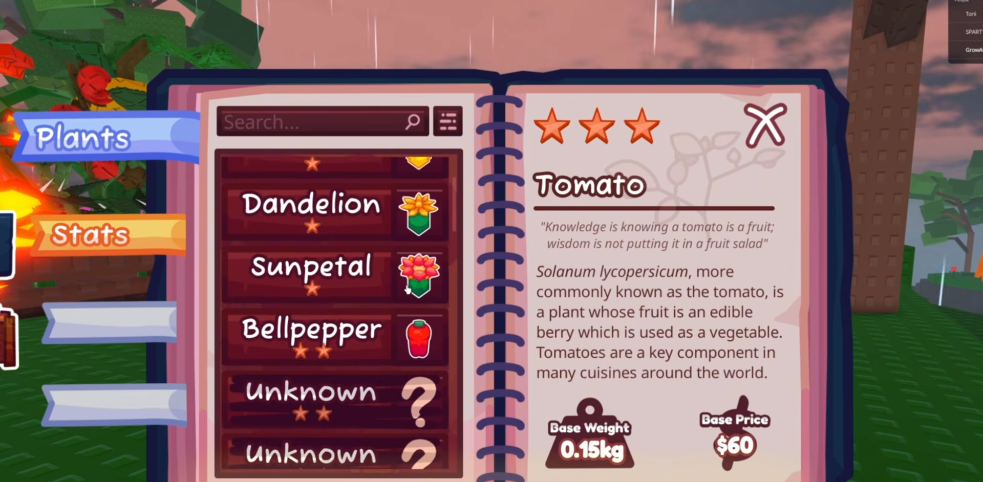You access the garden book to check stats like base weight and price for every plant.