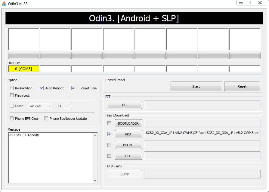 On Odin, click the PDA tab and select the .tar file you got in step 2 — CF-Root-SGS2_XX_OXA_LP2-v5.2-CWM5.tar (as shown in screenshot after step 9)