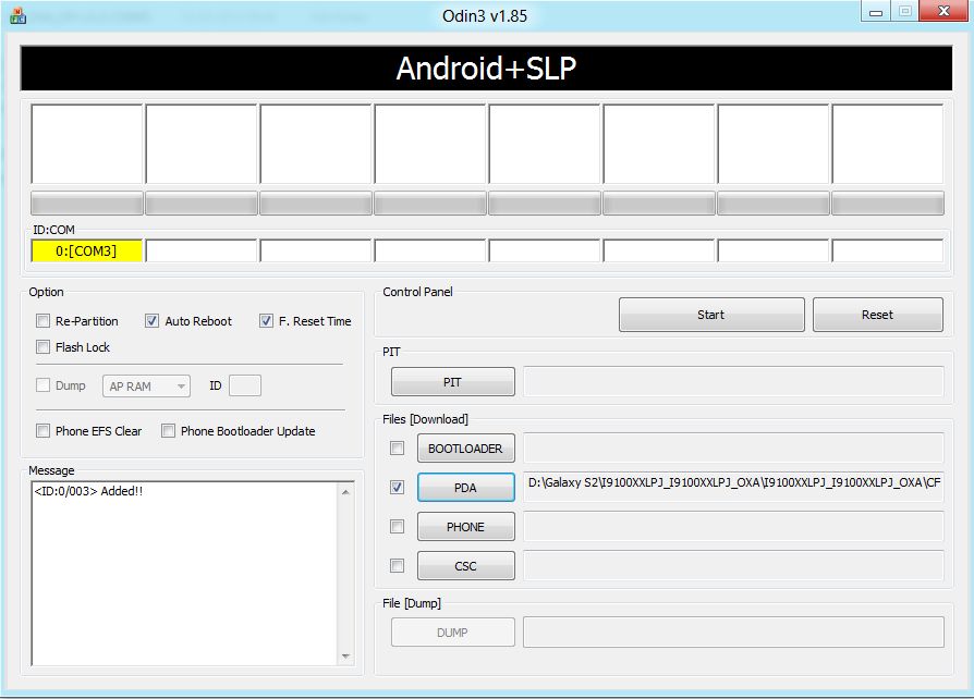 IMPORTANT Note: If ODIN gets stuck and doesn’t seem to be doing anything, or you get a FAIL message (with red background) in ODIN, do the following:Disconnect the phone from the PC, close ODIN, remove battery, re-insert it, turn phone on in Download mode again, and do the procedure again from Step 6.