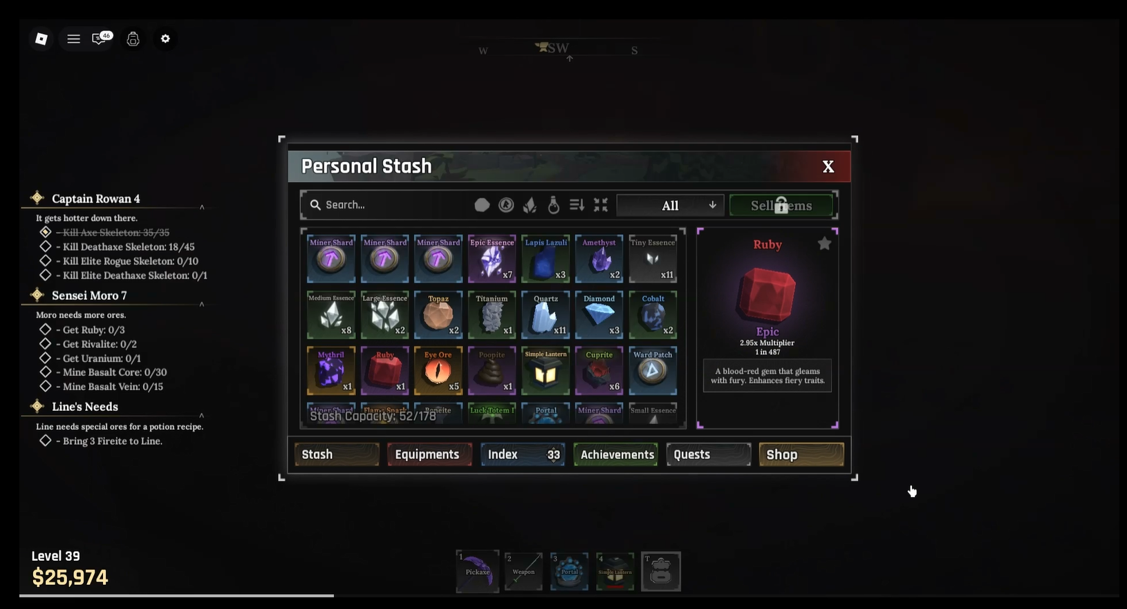 Ruby farming revolves around reaching the Forgotten Kingdom and targeting only Basalt Vein rocks, since these are the sole source of Ruby. Equip a strong pickaxe to speed up mining and improve your effective drop rate, and stack any luck bonuses available to further increase your chances. Move through high-density Basalt Vein zones in a consistent loop to minimize downtime and maximize the number of rocks you break per run. Because the drop rate is roughly 1 in 487, efficient routing and steady mining are the keys to collecting Ruby over time.