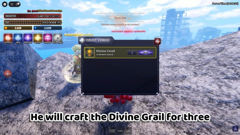 After obtaining three Broken Swords, travel to Boss Island. There you will find the Divine Grail Crafter NPC. This NPC converts your materials into the required summoning item.