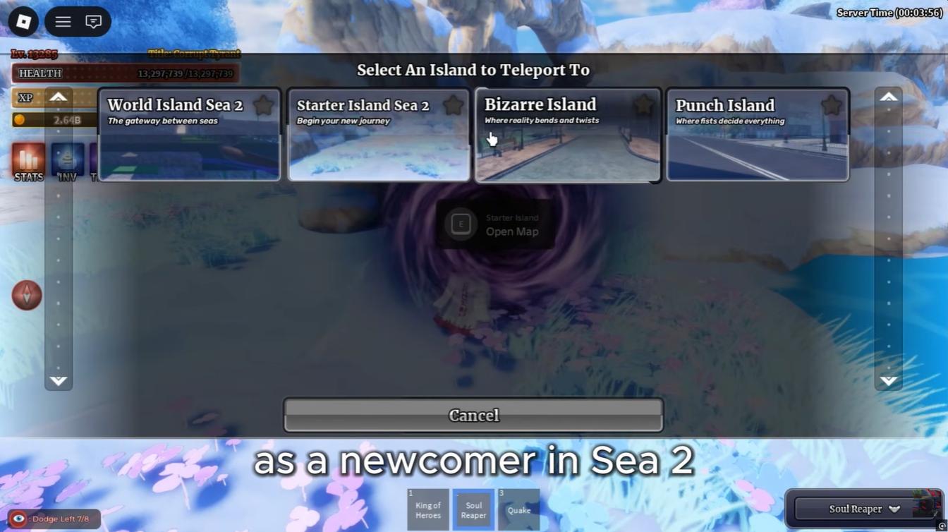 Once you arrive in Sea 2, your progression effectively resets in terms of difficulty scaling, so preparation matters. The best move is to head directly to Bizarre Island, where you can farm NPCs for early materials and boss summons.