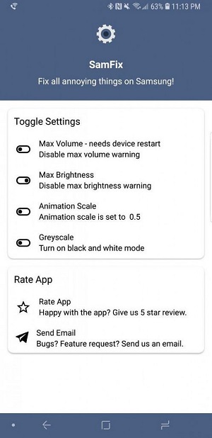 The app called SamFix is quite pristine, but very simple to use. It comes with four toggles and each one solves a separate annoyance. Note that SamFix requires the correct adb permissions and root access.